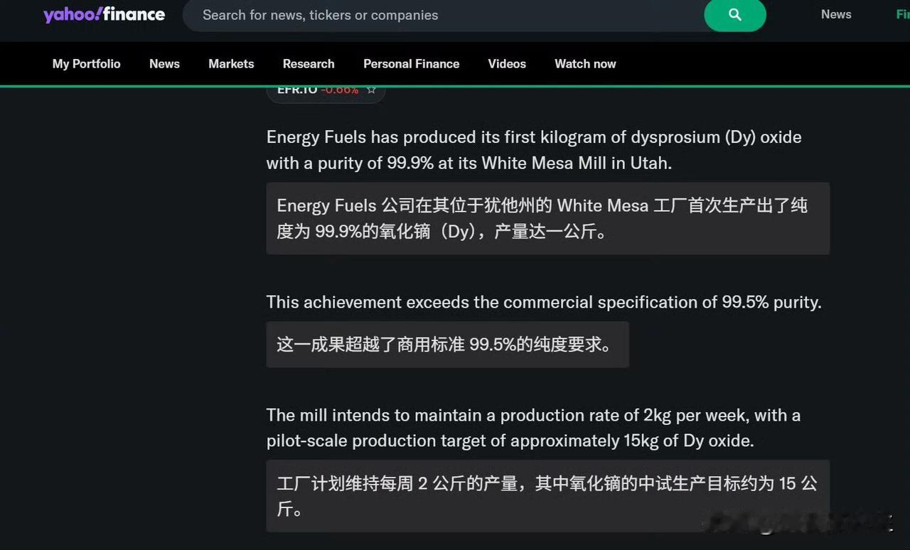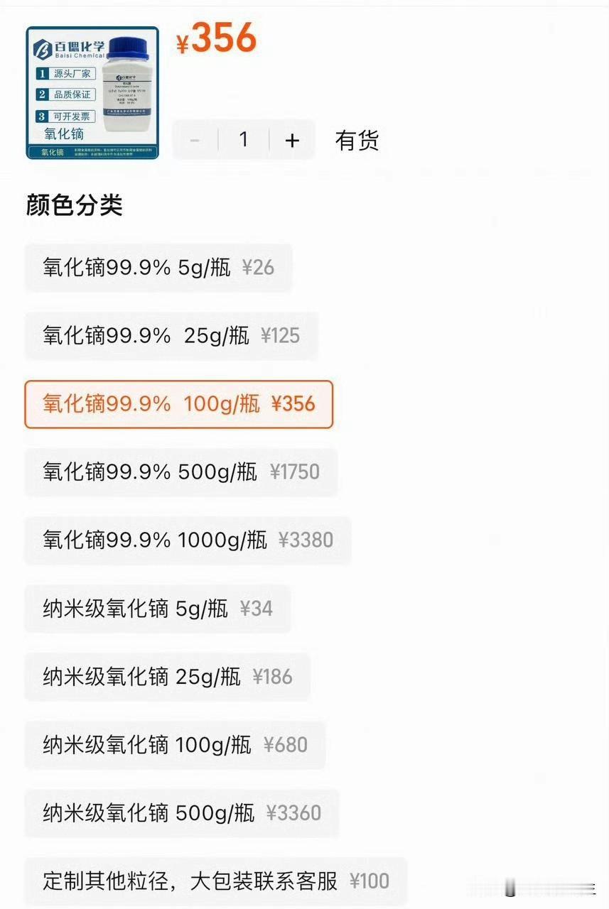 原来以为美国一家公司研究出高纯度稀土有多高大上,原来某宝这种东西随便卖,一克才三块多。 前几天美媒报道美国Energyicon Fuels公司生产出了高纯度稀土,一个月产量达到了0.0085吨。看了报道有些担忧,他们这么快就研究出了稀土。 结果今天的报道一出,才知道他们生产出的稀土元素是氧化镝,这个不算什么高科技的东西,某宝上就有卖的,99.9%纯度氧化镝100克356元,一克才3块多。 美媒的不断提高关键矿物能力,巩固美国在稀土领域商业化产能,完全脱离中国供应链稀土氧化物生产体系听起来就像个笑话。如果真的每月生产0.0085吨的话,还不如直接去某宝下单算了。