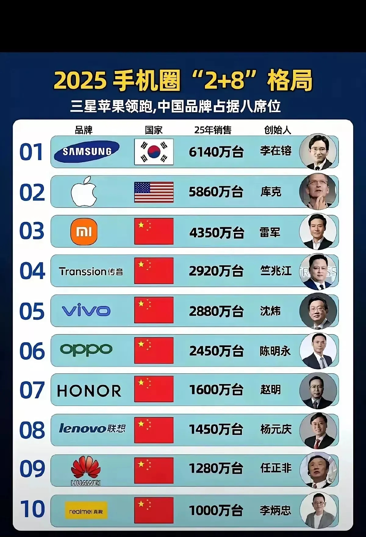 换句话说就是三星、苹果领跑,然后剩下八家主流品牌则均为国产品牌。