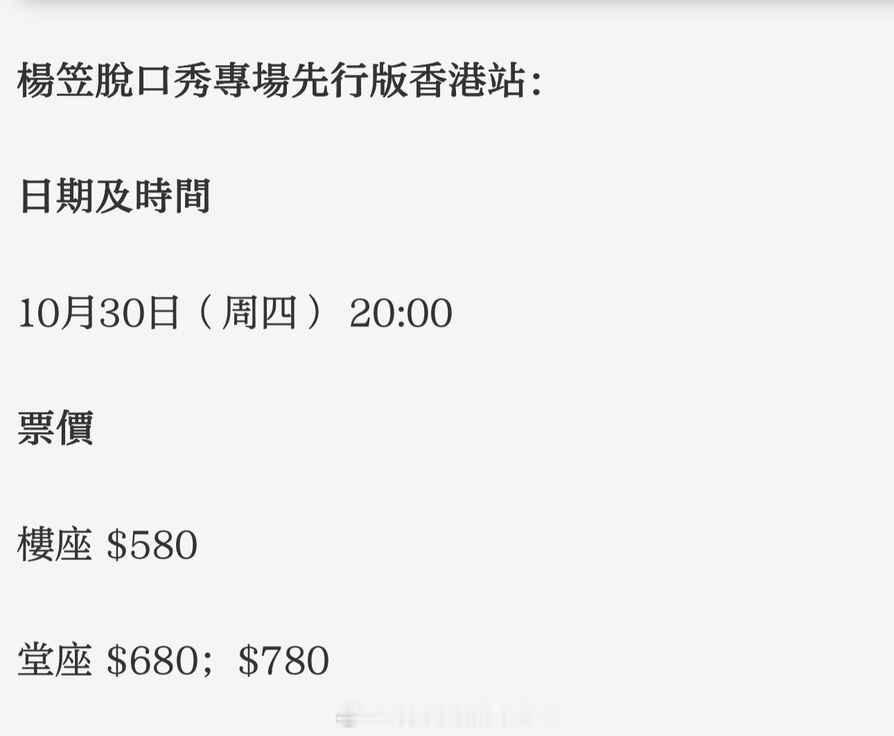 「(有視頻)杨笠脱口秀 香港站10·30開咪…今午開售最低$580 … 大公文匯全媒體報道,杨笠 第一個脫口秀專場巡演到香港啦!先行版只此一場,it is time!由香港離譜喜劇主辦的《楊笠脫口秀專場先行版香港站》將於10月30日(周四)晚20:00在柴灣青年廣場Y綜藝館舉行,10月23日14:00準時開票。(點此購票)