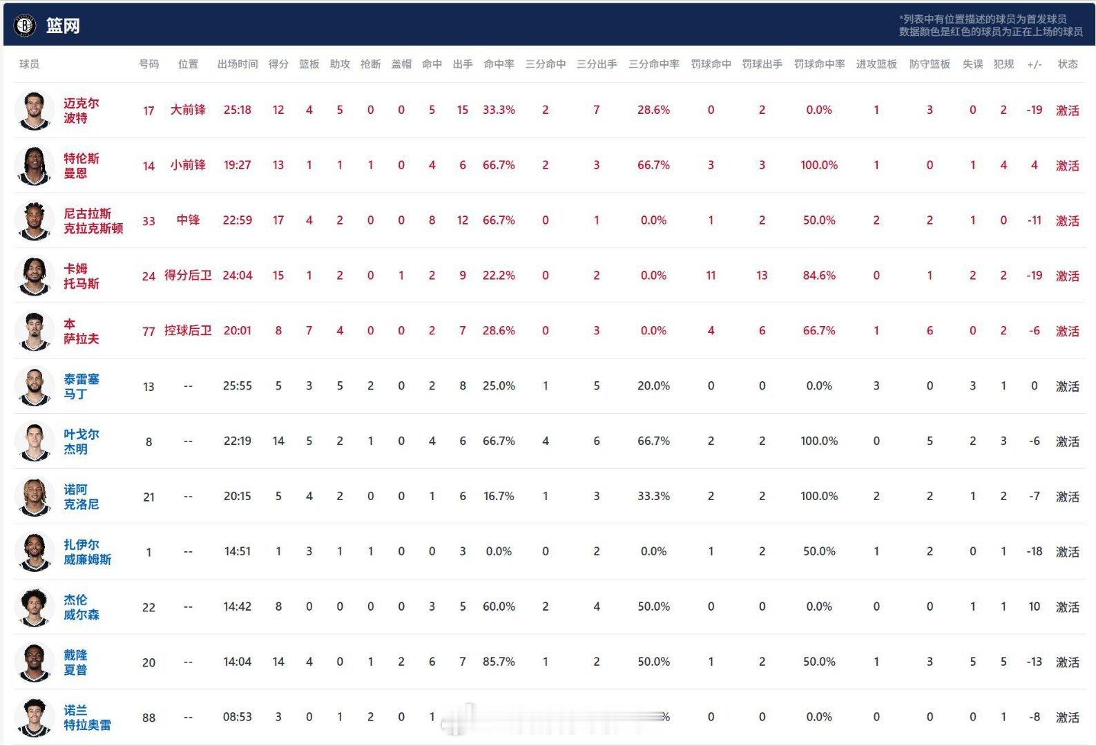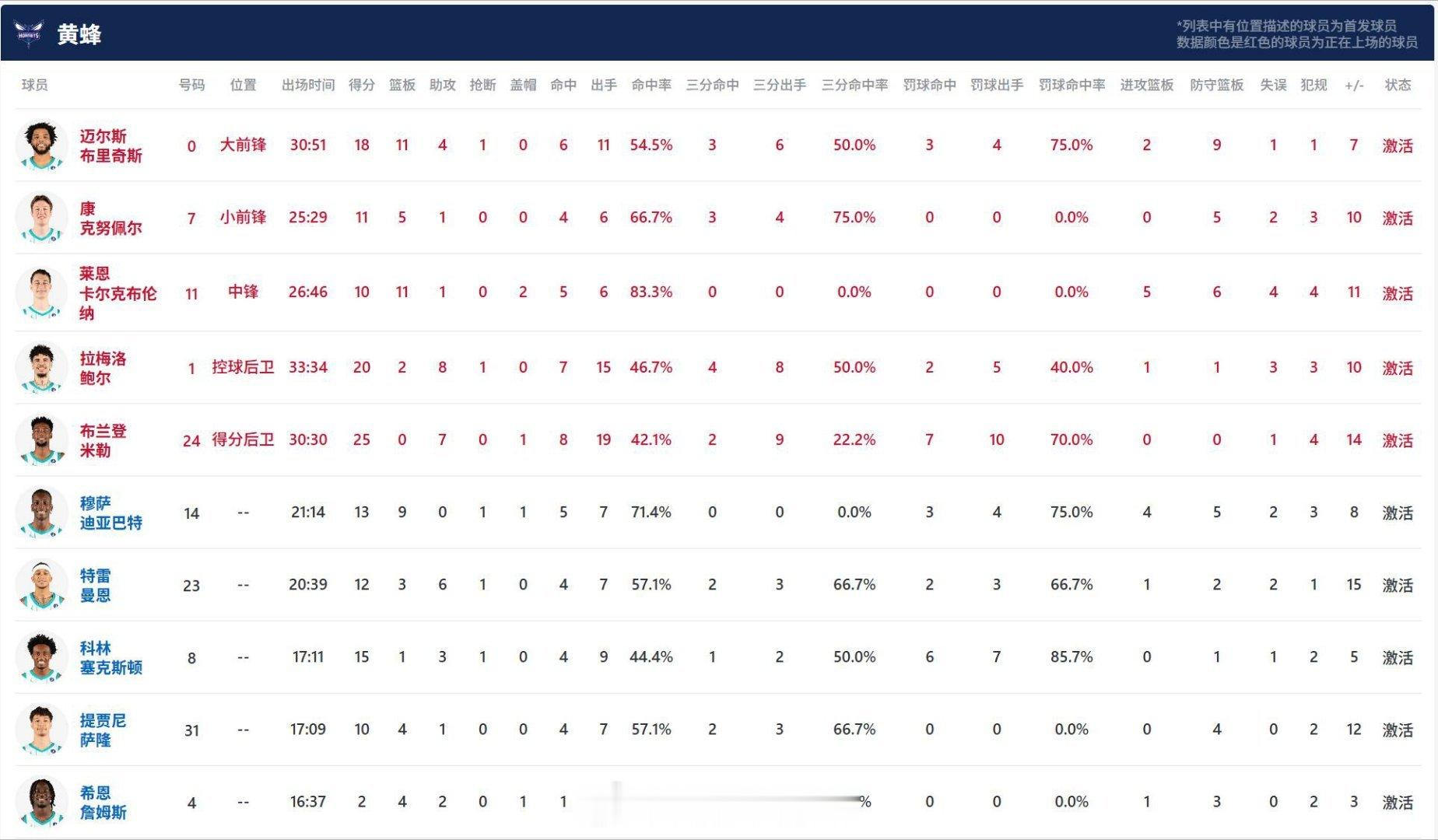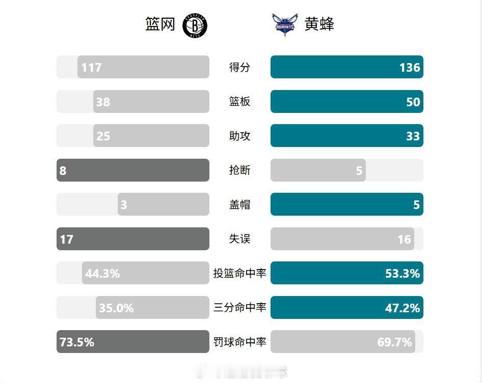 黄蜂全队命中率高达53.3%,轰进17记三分,布里奇斯18分11篮板、卡尔克布伦纳10分11篮板、迪亚巴特13分9板撑起内线,8人得分上双展现恐怖深度。篮网虽有克拉克斯顿17分、托马斯15分等6人上双,但44.3%的命中率和篮板劣势难掩颓势,第四节卡尔克布伦纳空切暴扣彻底浇熄其反扑希望。