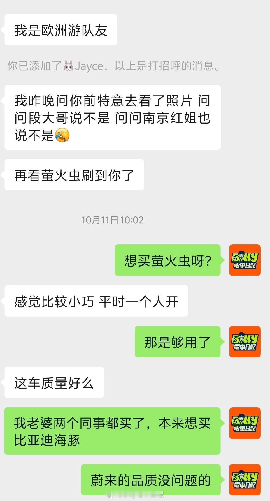 十年前装修写装修日记拿了冠军去欧洲游了一趟,那位就是一起去的团友,在宁波的,她说最近在看蔚来萤火虫,就刷到我试驾萤火虫在苏州老街的试驾视频,第一眼看有点像我,但是问了其他几个人,都说不是我(我确实比之前胖了很多[泪奔]