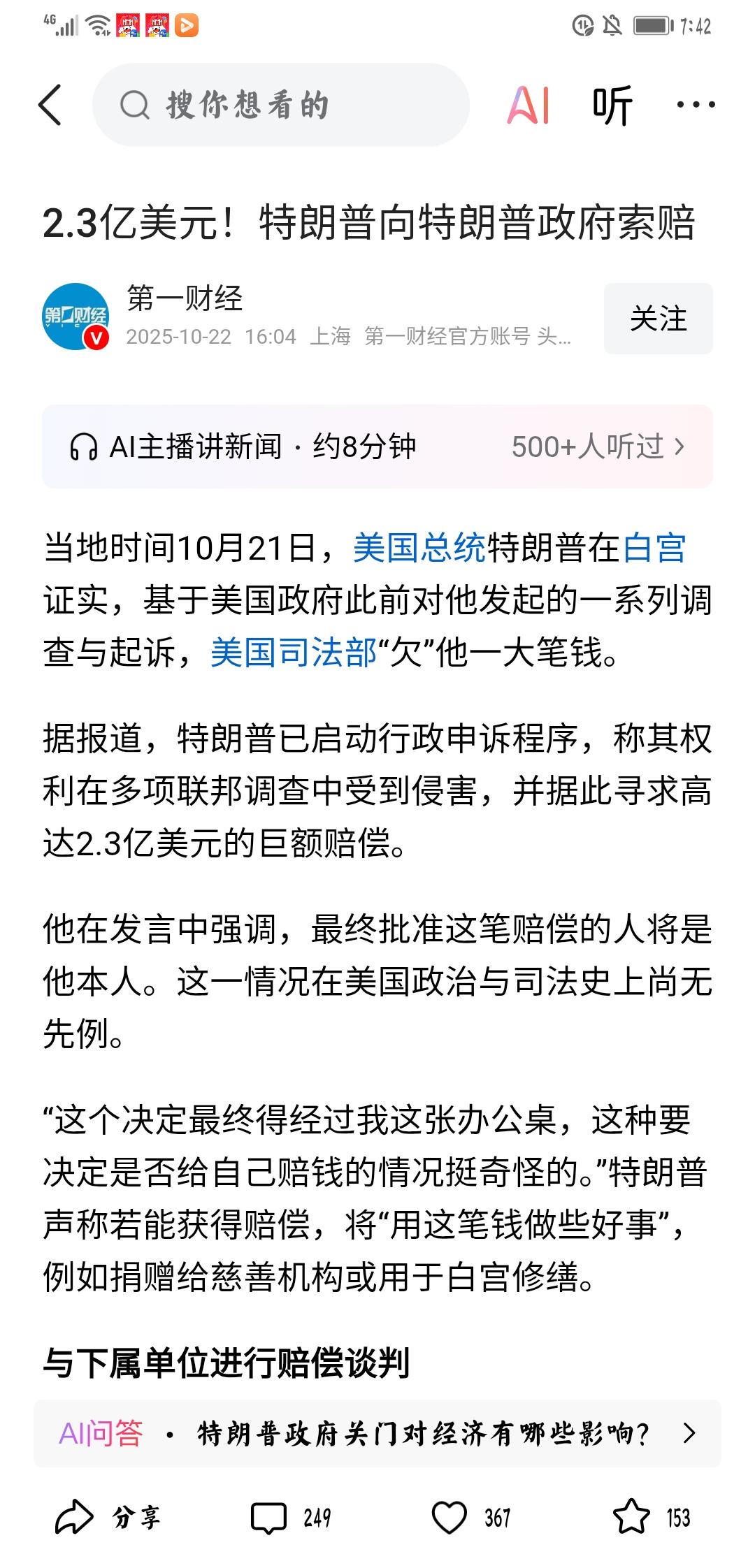 特朗普承包全球第一笑点 个人观点:对特朗普的任性将会达到新的高度,甚至可以说是荒唐至极,匪夷所思。特朗普起诉特朗普政府索赔2.3亿美金,只能说特朗普风格的生财有道。美国建国以来,首开先例的拆白宫第一人。 热点 美国