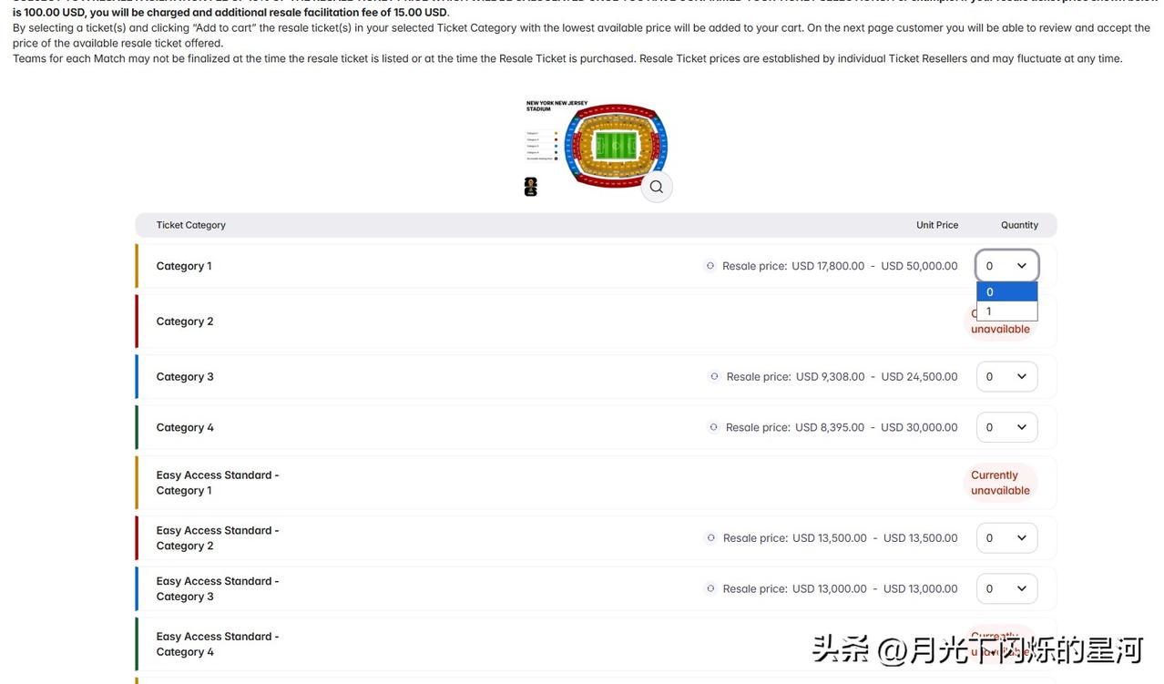 明年世界杯,决赛门票炒上天! 今天我可以买票,但西雅图正常票都没了。纽约决赛票当然也没了。于是去纽约的marketplace看一眼,决赛票倒是有,可第一档的炒到5万美元,第四档都要8300美元。世界杯门票开售 世界杯门票 世界杯抢票 世界杯