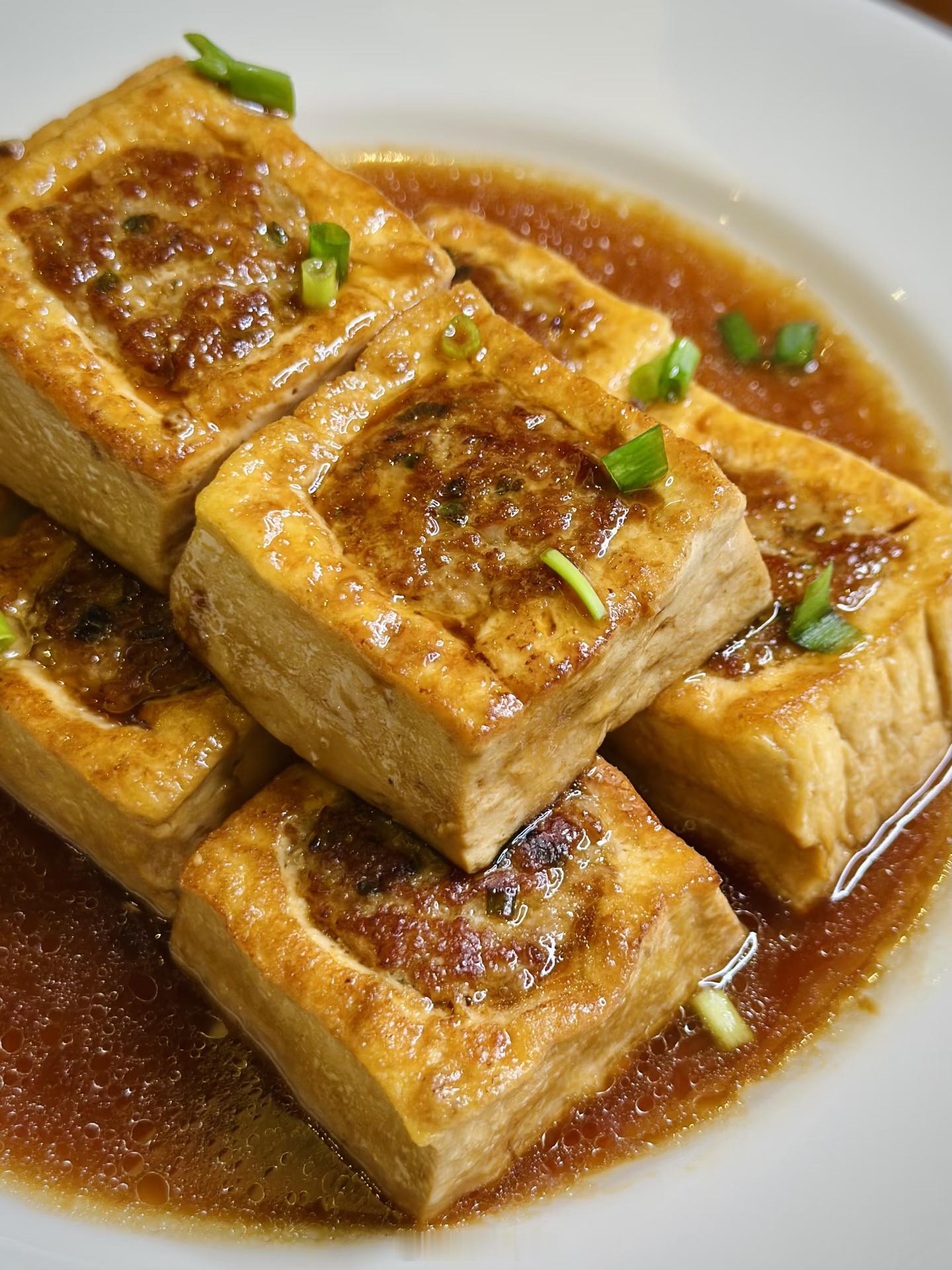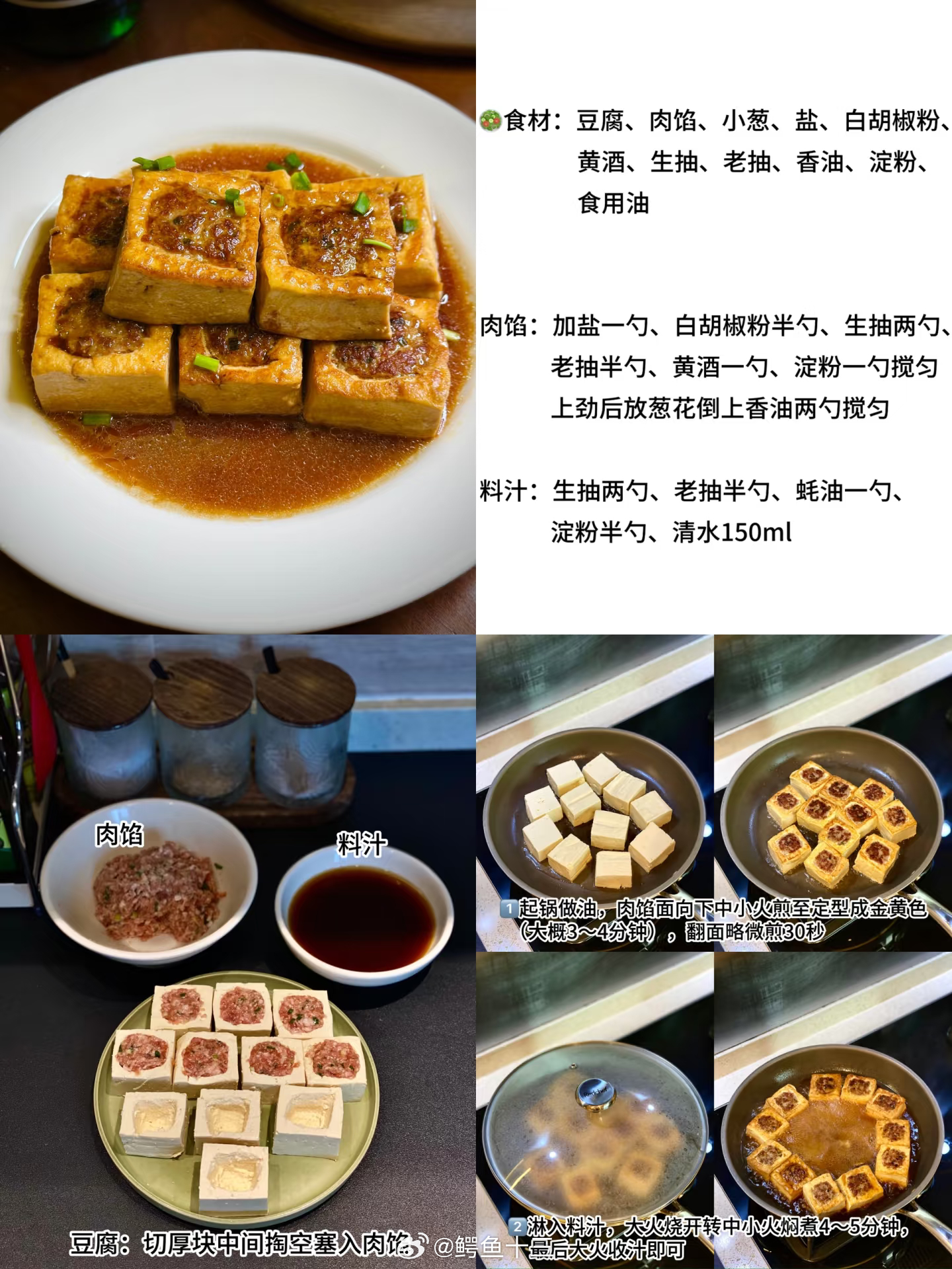 豆腐酿肉烧」酥皮锁汁 外焦里嫩 警食材: 豆腐、肉馅、小葱、盐、白胡椒粉、黄酒、生抽、老 抽、 香油、 淀粉、食用油。