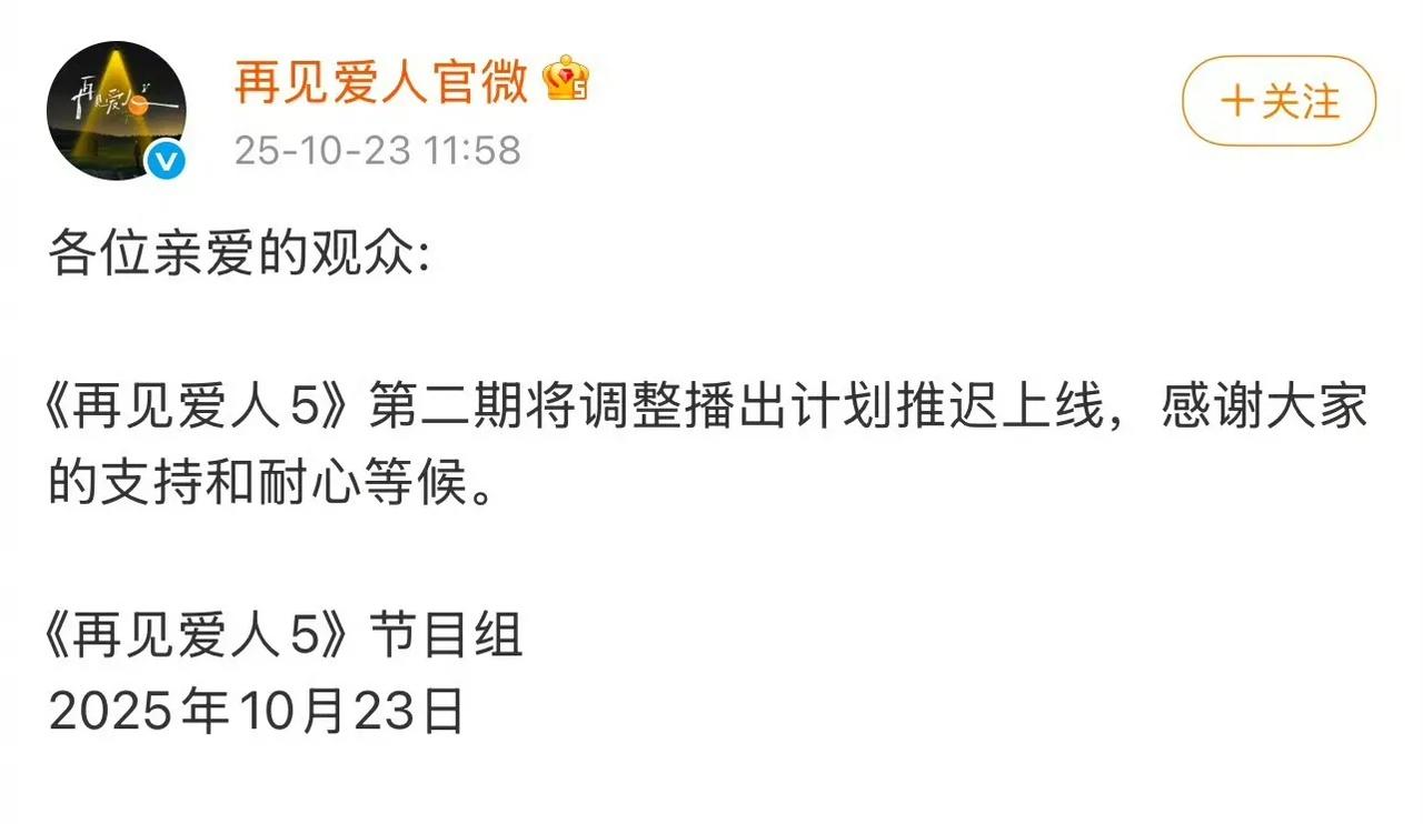 《再见爱人5》延期背后:是技术调整,还是嘉宾争议的无奈? 10月23日,节目组突