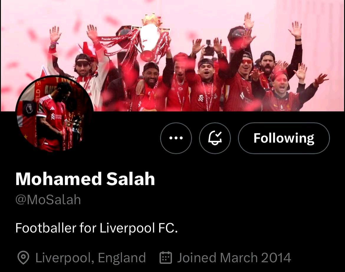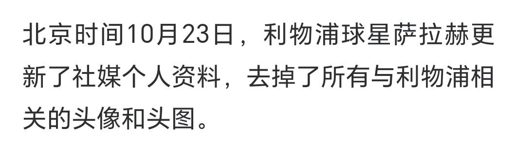 利物浦更衣室要出事了么……就因为这场欧冠让法老替补…… 萨拉赫将自己社媒的头像改成了和家人的照片,背景图也删掉了和卧铺相关的照片,同时删除了自己利物浦球员的简介。 今天凌晨欧冠联赛第3轮,萨拉赫被放在替补席,结果球队5-1大胜,终止了近期各项赛事的4连败。 比赛中,萨拉赫面对队友维尔茨跑出来的空门机会,没有选择传球。 图二是之前的社媒封面。 图三是今天的社媒封面。