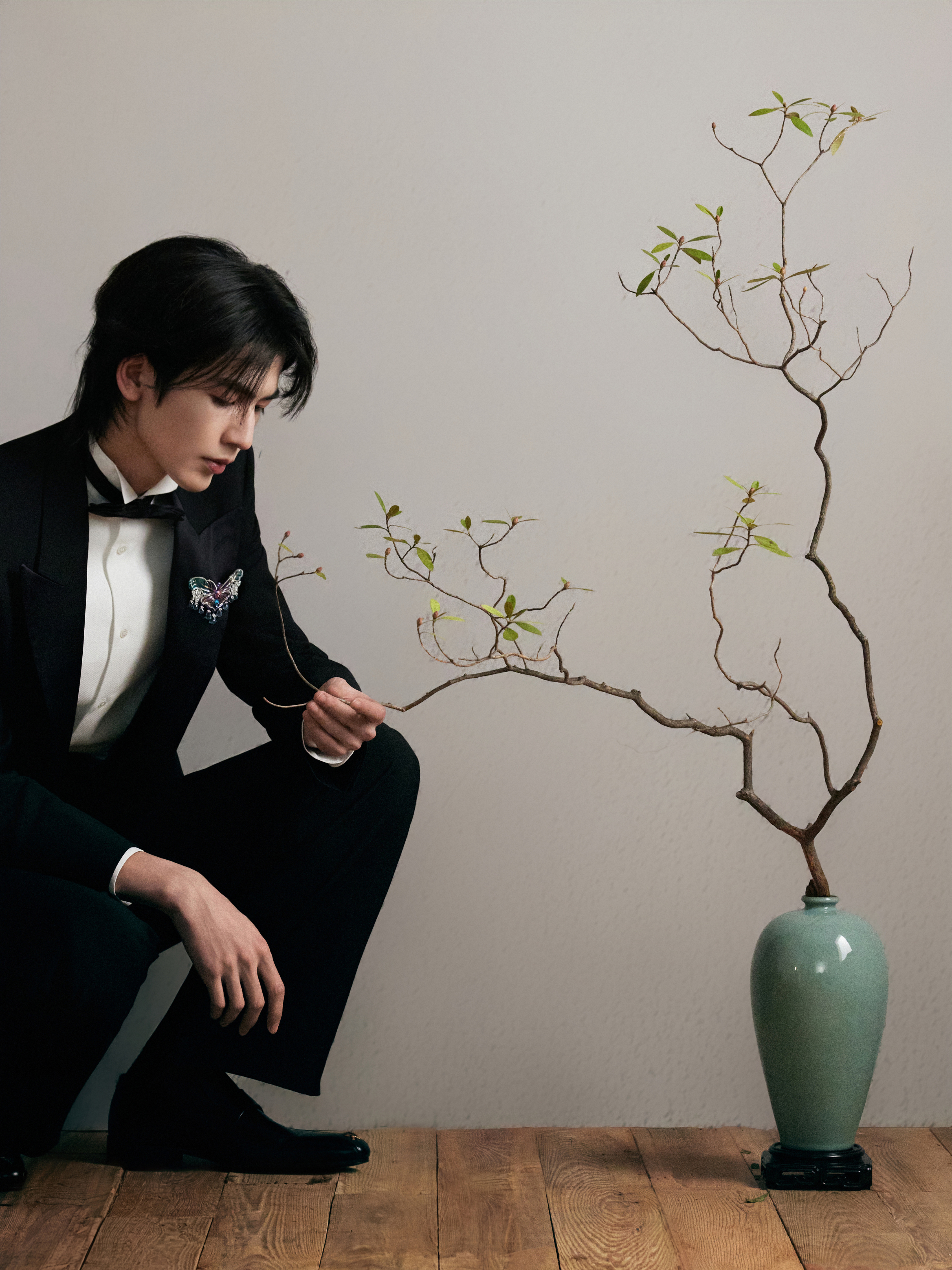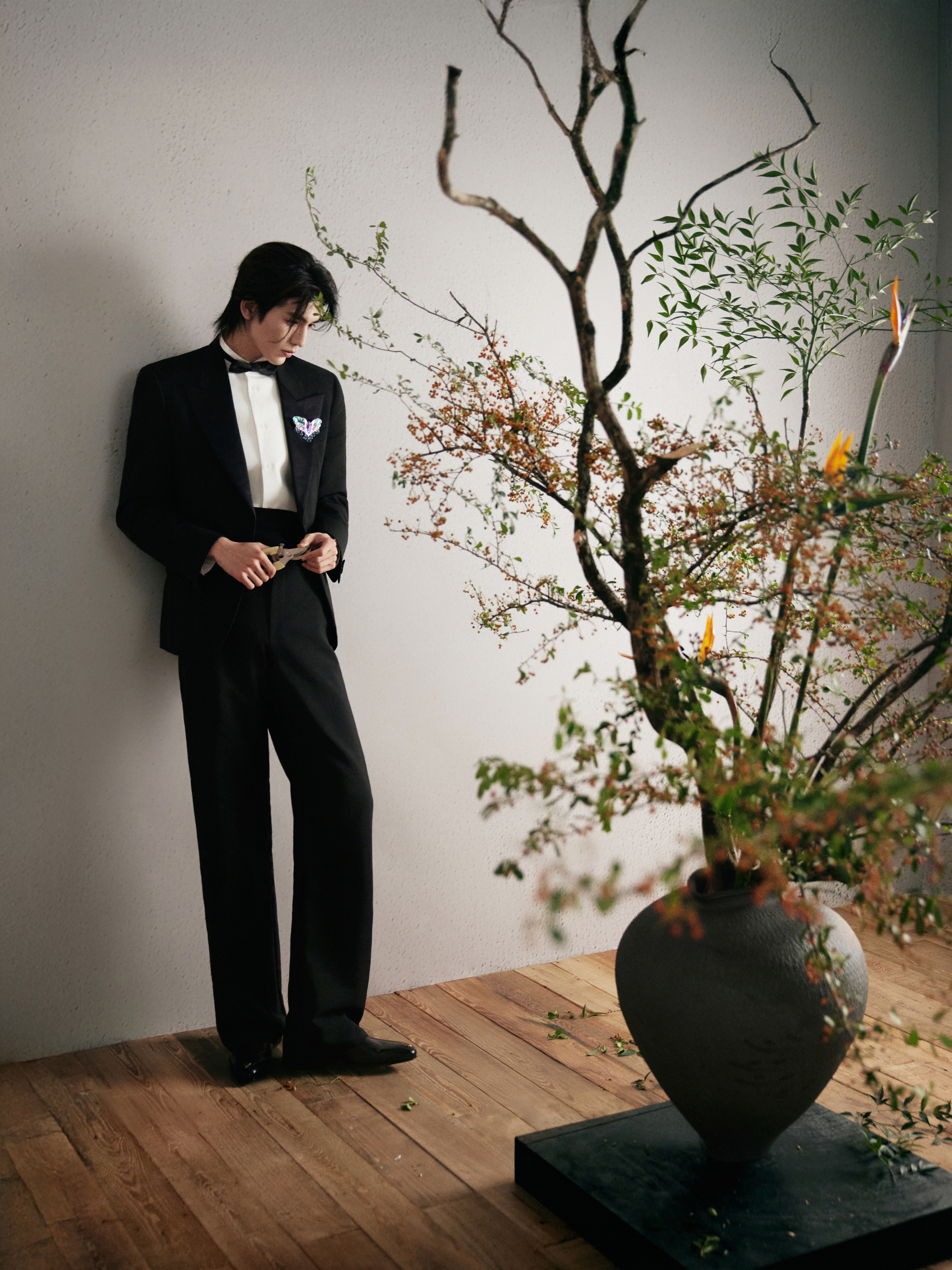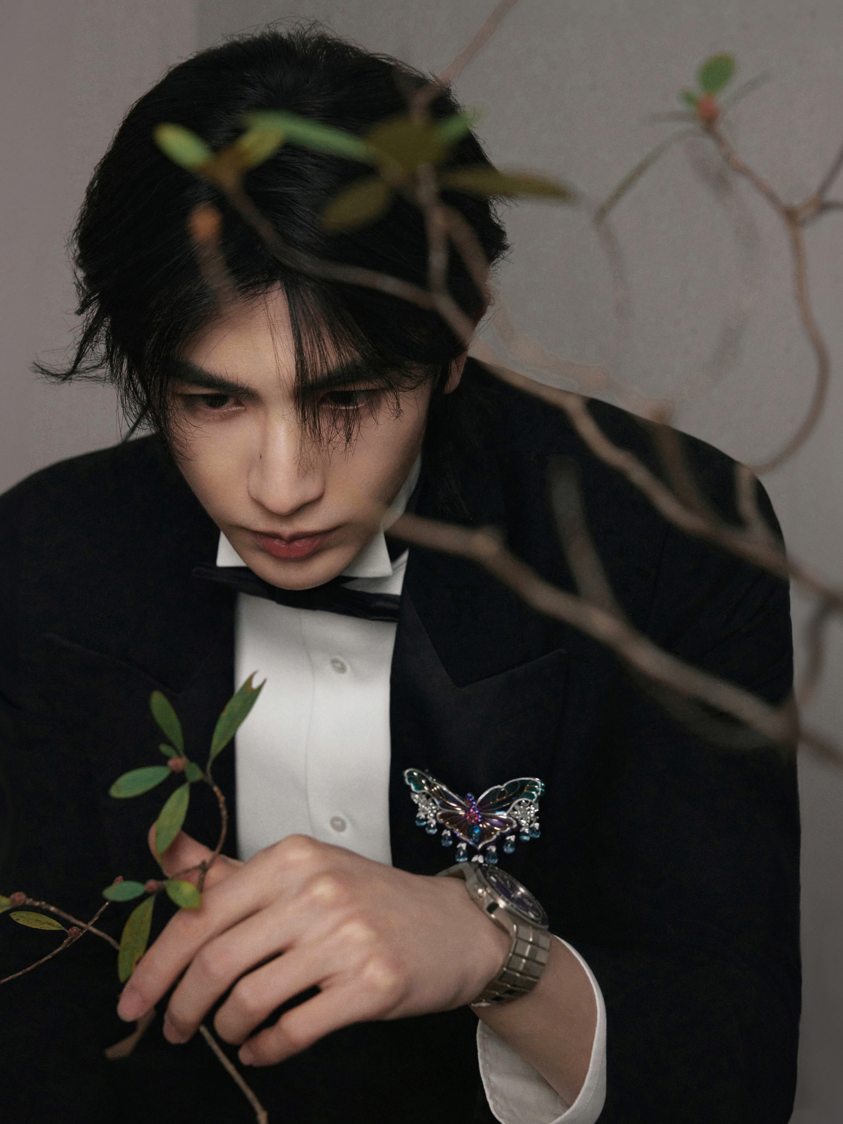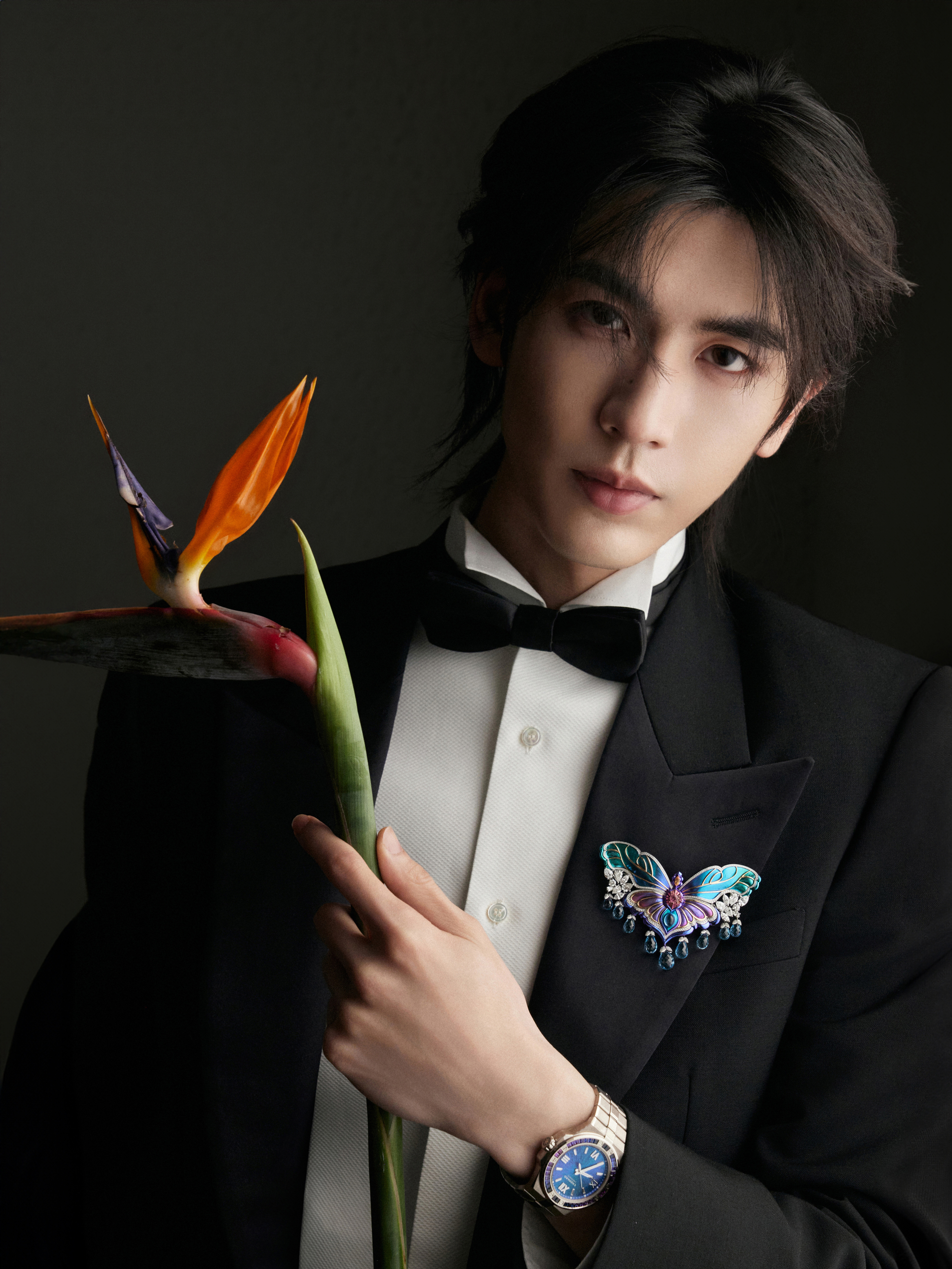 中式插花的雅致意境之下化身贵公子登场 ,GUCCI by Demna 2026 春夏系列黑西装以一枚闪耀的 Chopard 高级珠宝蝴蝶胸针及彩钻腕表点缀 ,双奢加持之下的精彩一览 ,矜贵不凡 、熠熠生辉 🦋💐✨