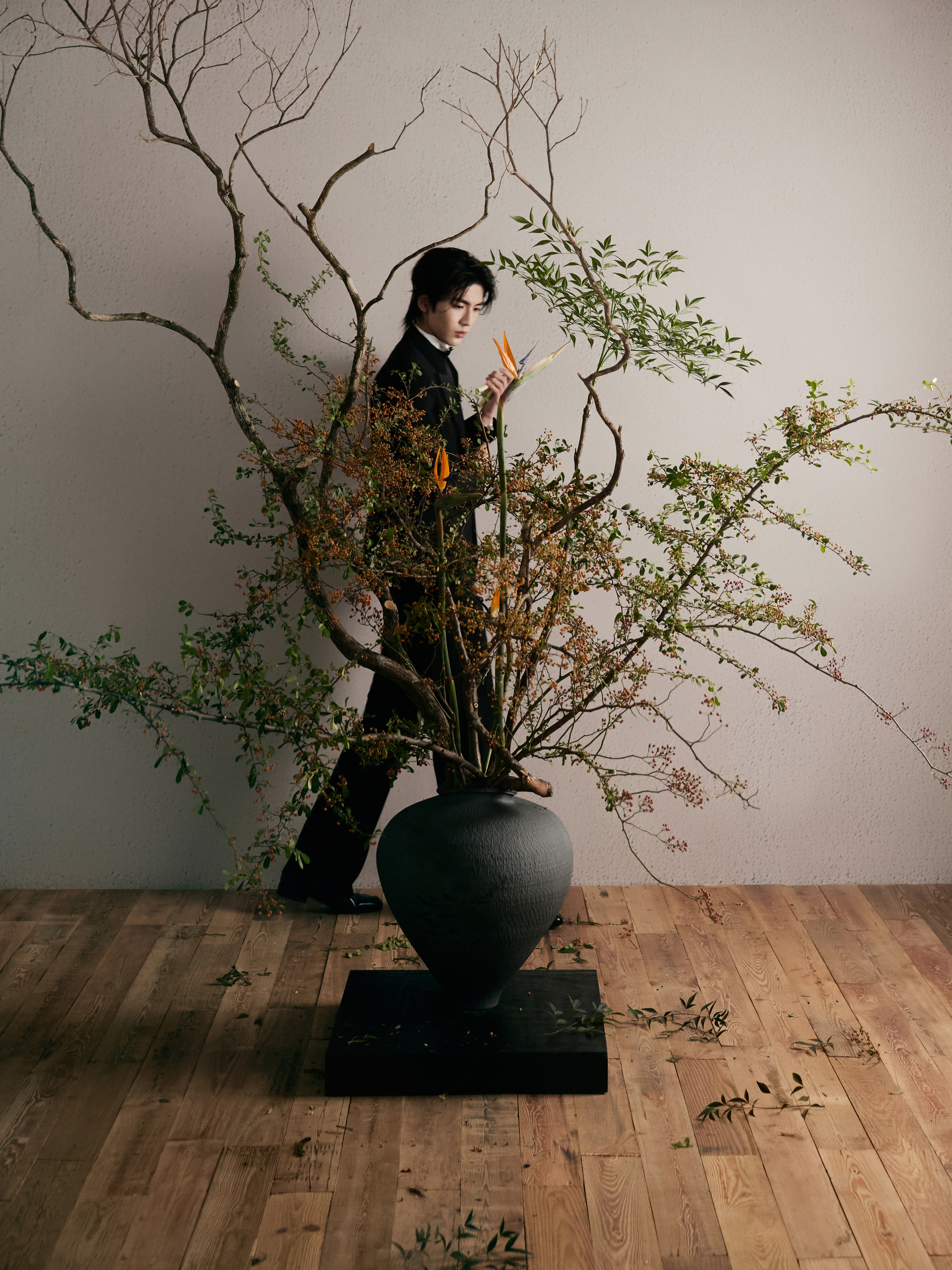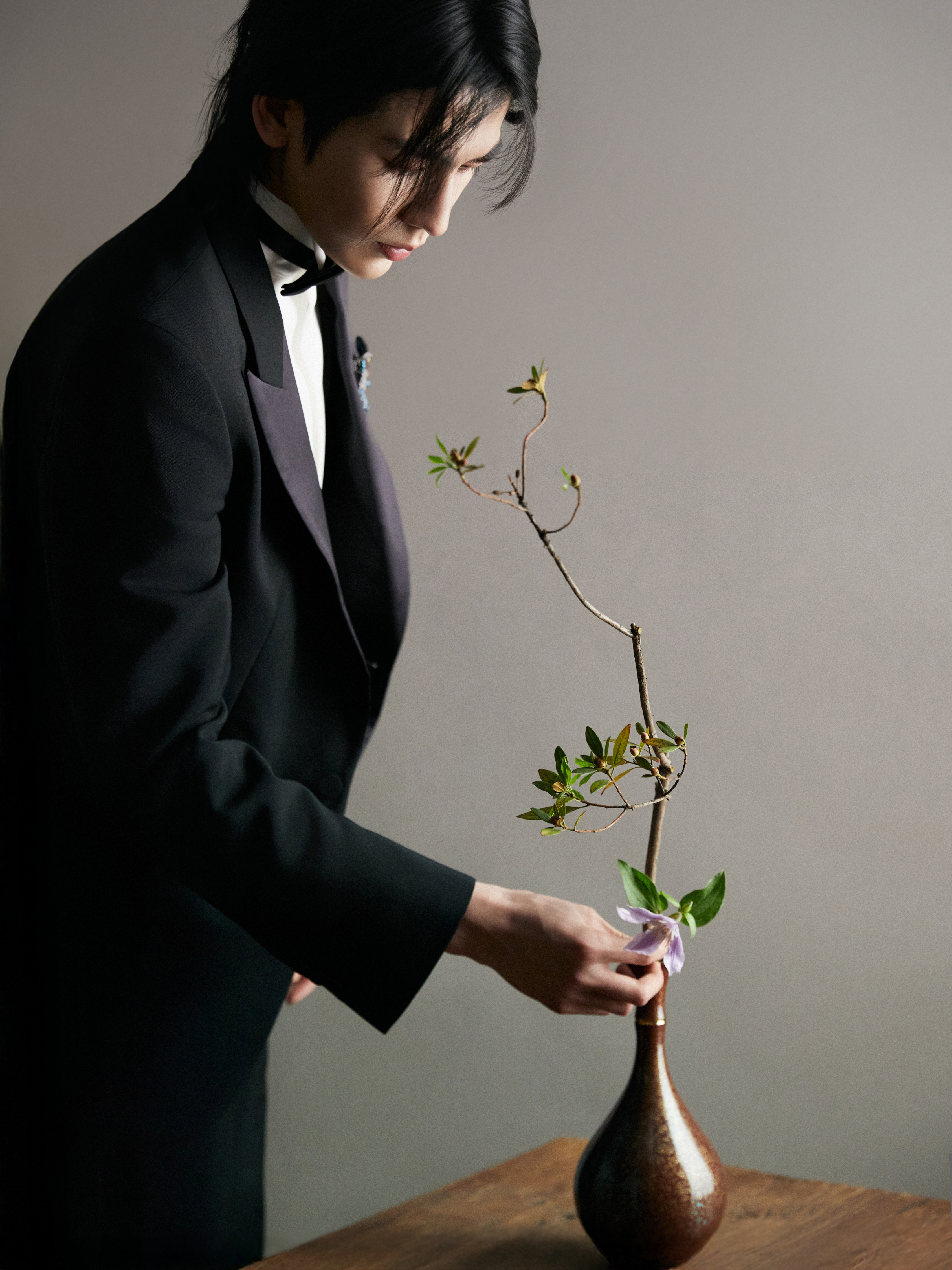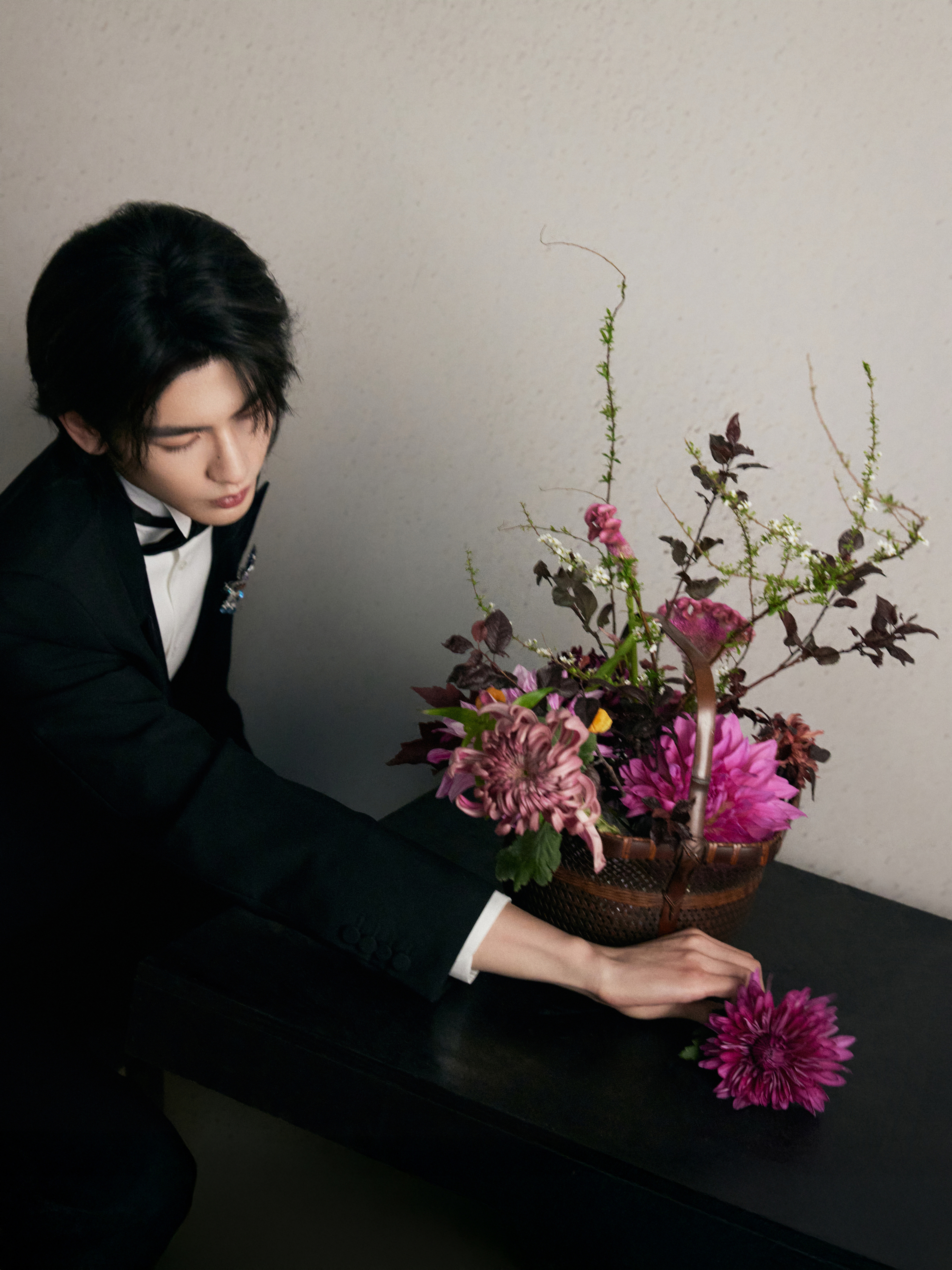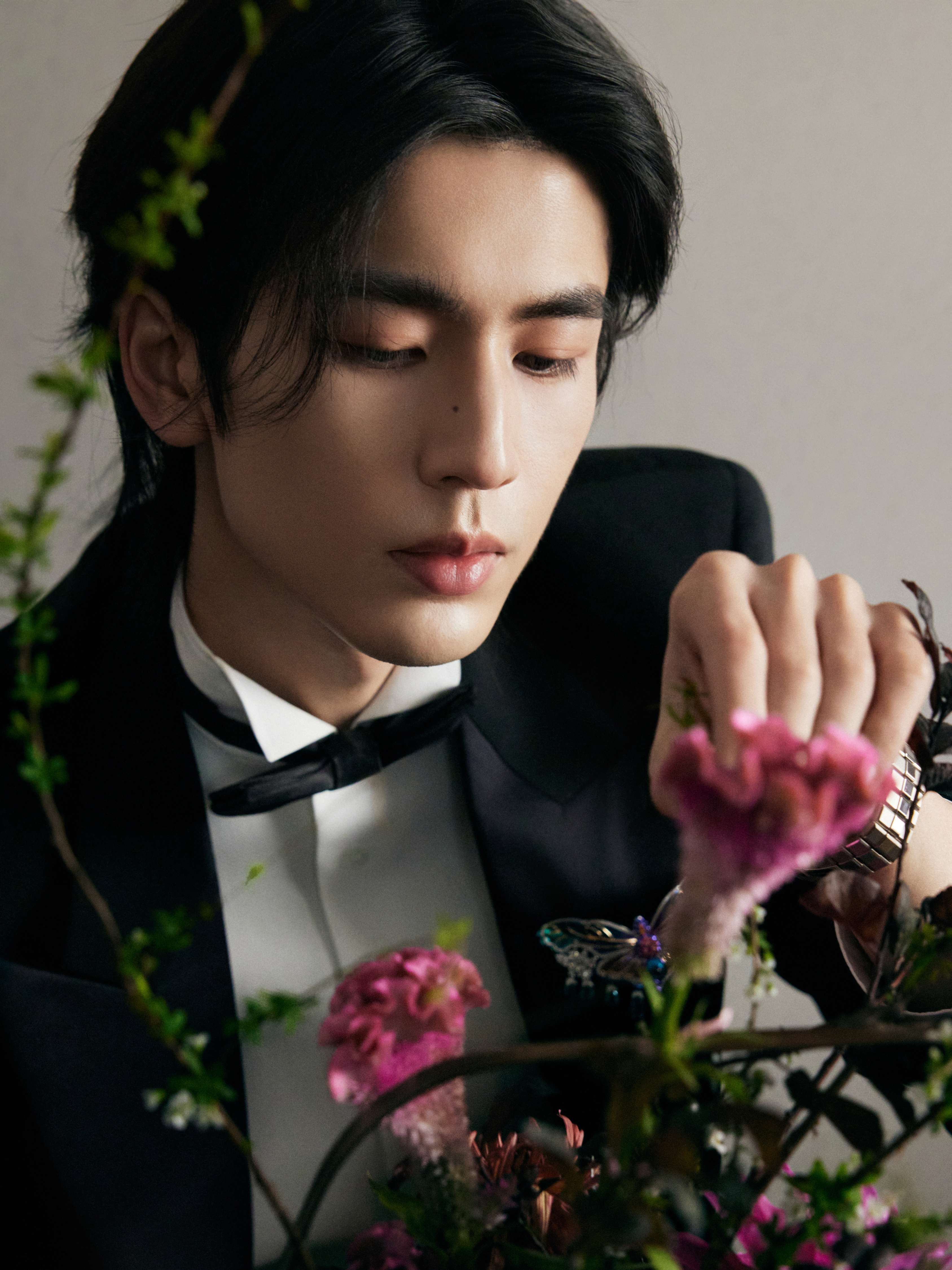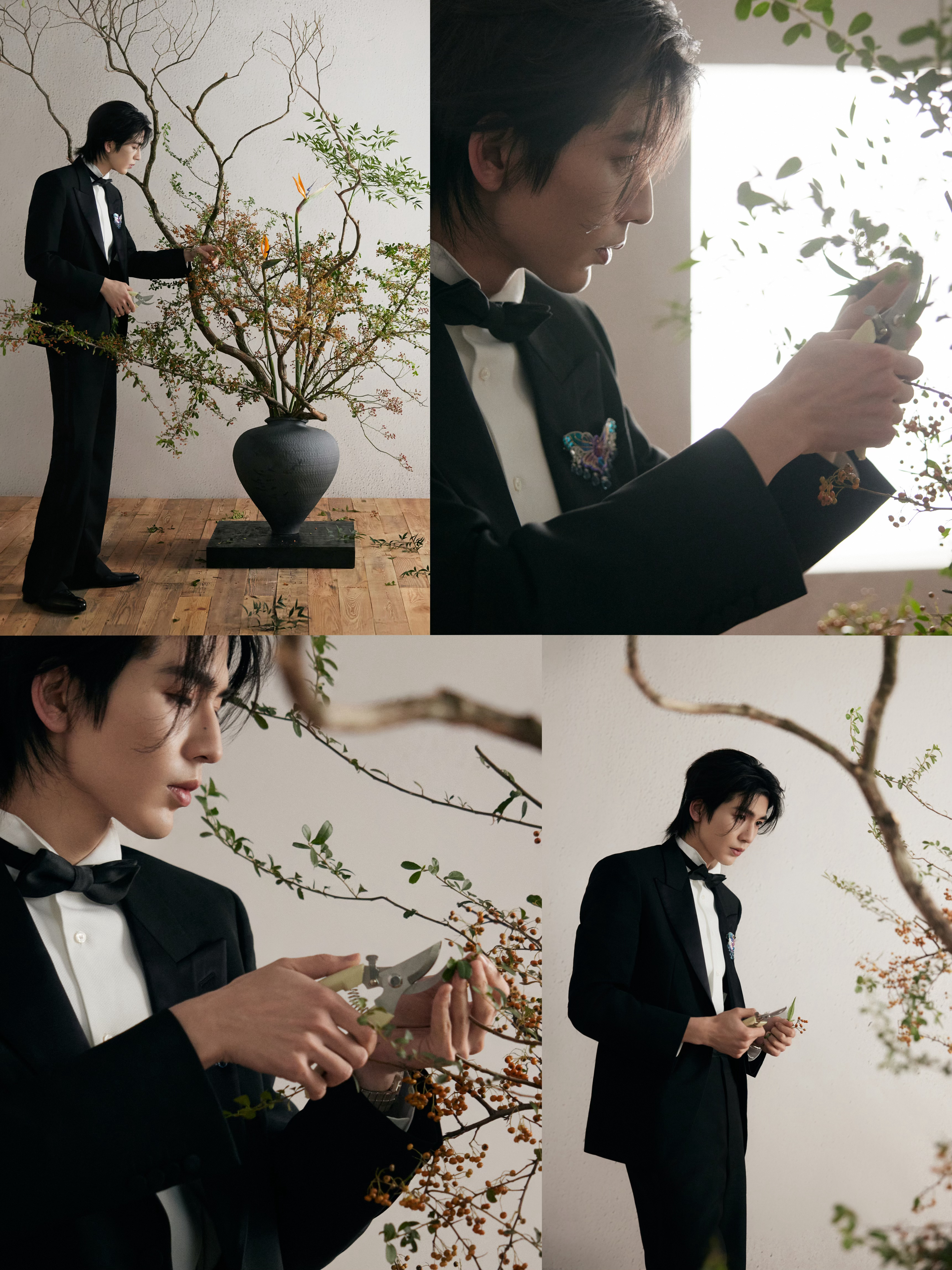 中式插花的雅致意境之下化身贵公子登场 ,GUCCI by Demna 2026 春夏系列黑西装以一枚闪耀的 Chopard 高级珠宝蝴蝶胸针及彩钻腕表点缀 ,双奢加持之下的精彩一览 ,矜贵不凡 、熠熠生辉 🦋💐✨