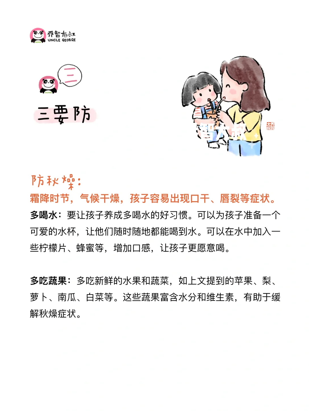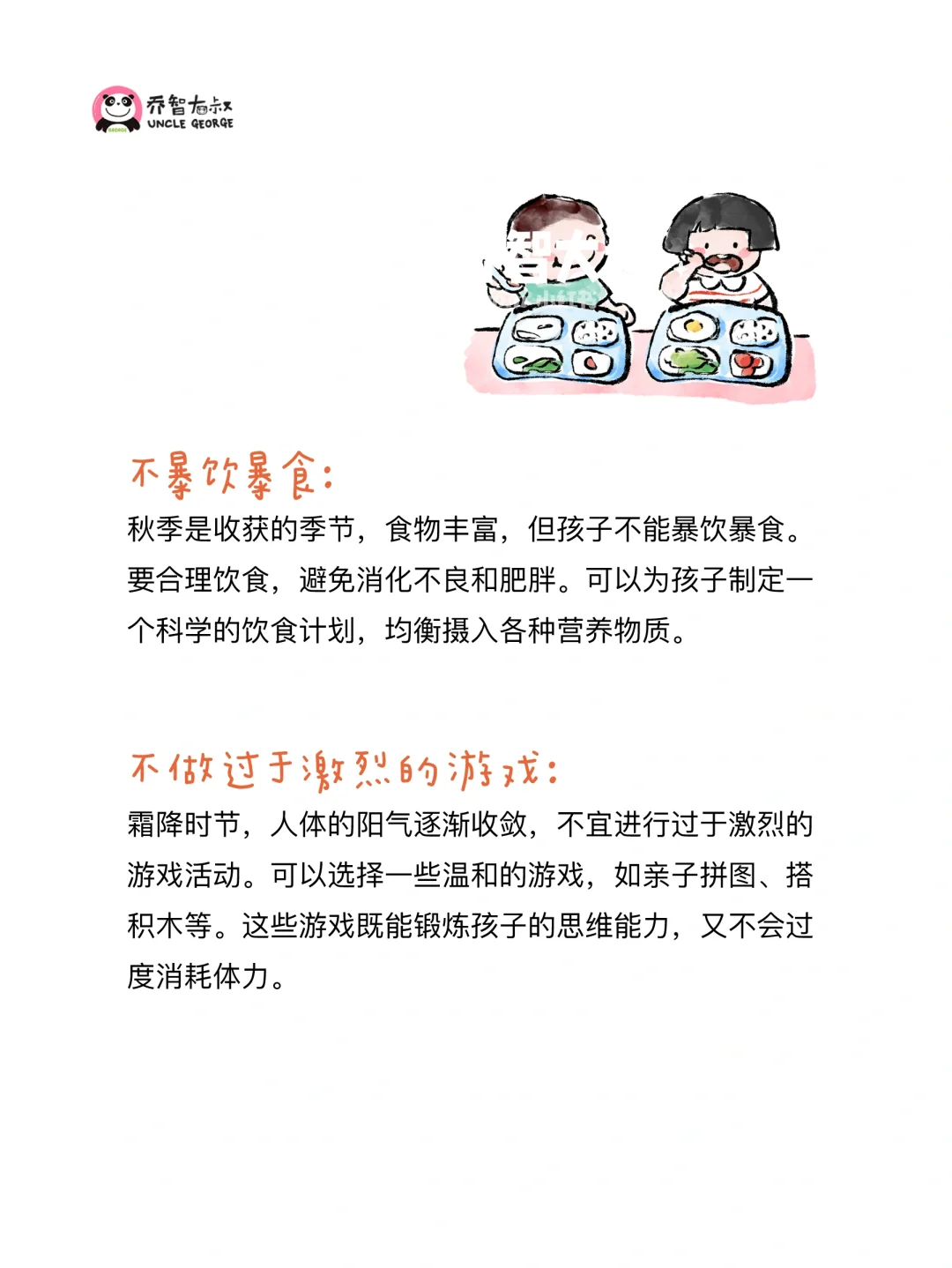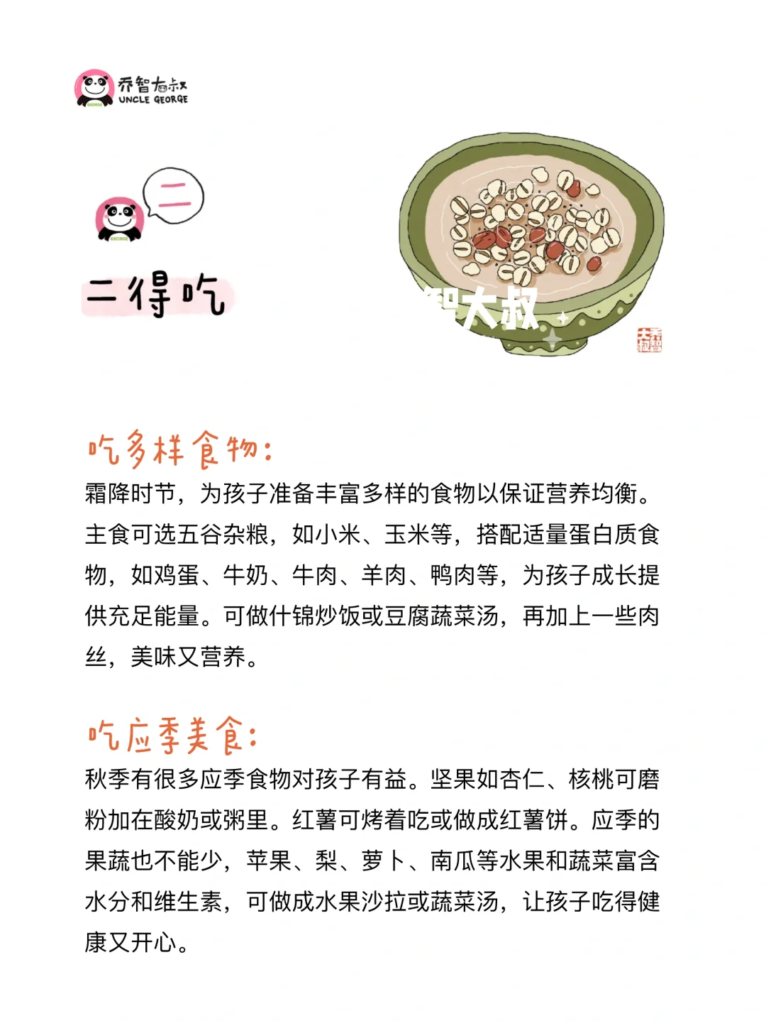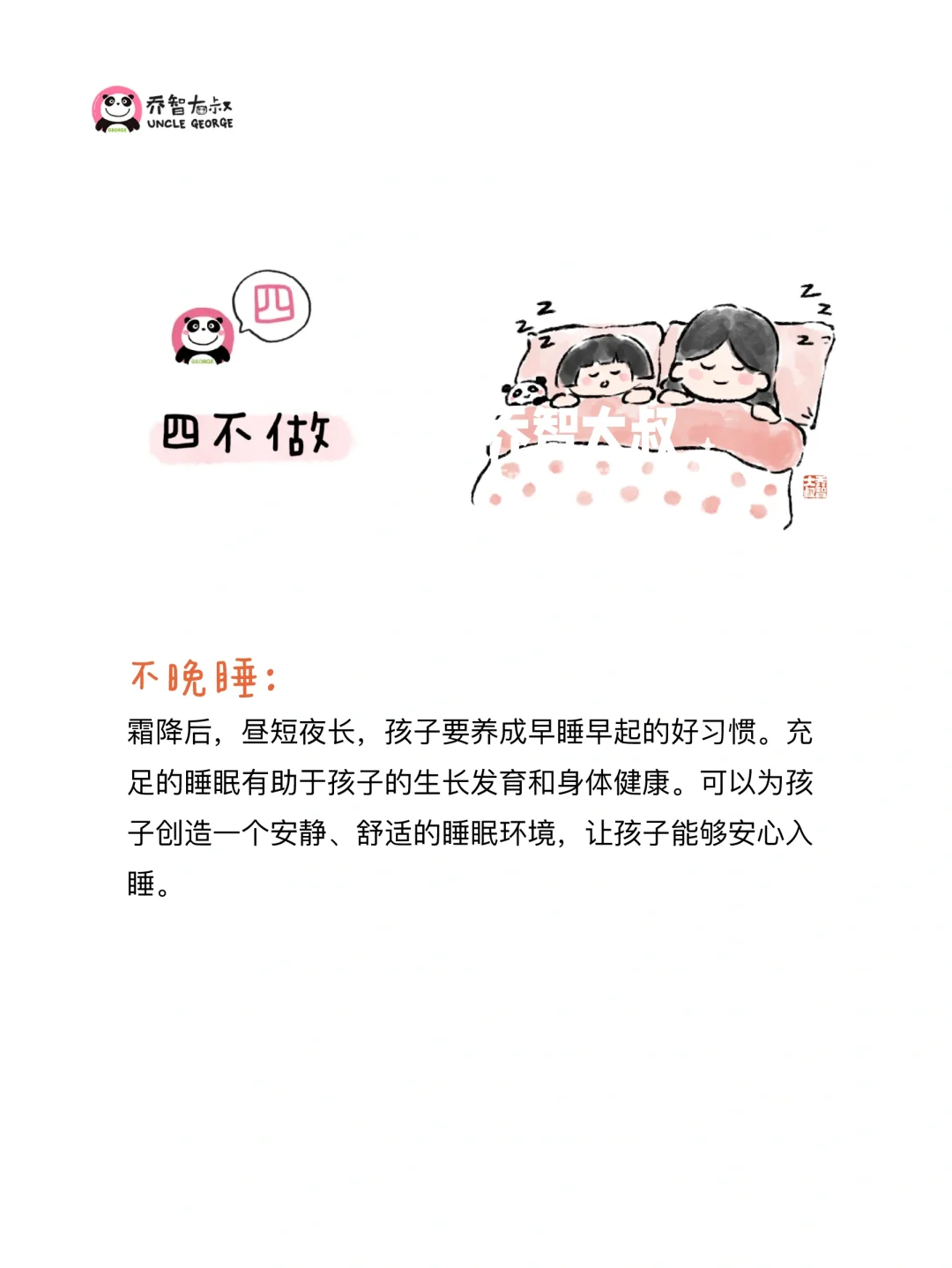霜降,是秋季的最后一个节气, 意味着天气渐冷、初霜出现。 霜降一到,秋冬模式正式开启啦! 在这个时节,家长们要更加关注孩子的健康, 牢记“四部曲”,孩子健康入冬少生病~ 让孩子安然、快乐地度过 秋天最后一个节气。 明日霜降,让我们一起 为孩子的健康保驾护航, 让孩子们在这个美丽的季节里茁壮成长。