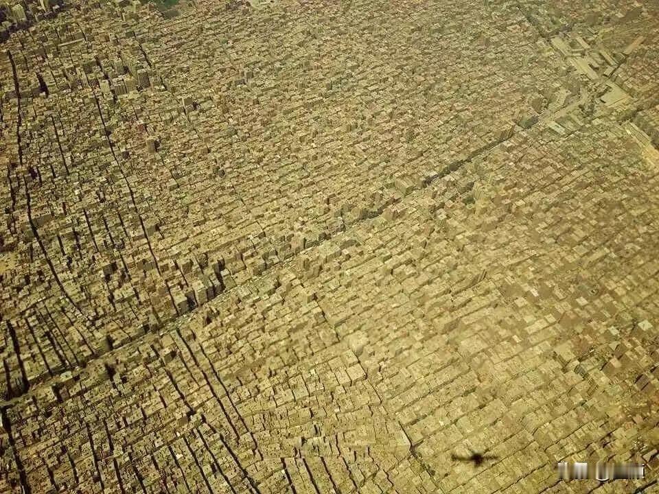 看惯了高楼林立绿草如茵的城市俯瞰图,发几张不同的,下面这三座城市俯瞰图你知道是哪里吗? 图一,从高空俯瞰埃及开罗,乍一看还以为是一块粗糙的树皮…沙漠上覆盖着一层混凝土,看不到一点绿色 图二、混凝土的海洋: 墨西哥城,西半球人口最多的城市,丘陵和山谷也无法阻挡城市的扩张… 图三,吉尔吉斯斯坦比什凯克,这座山谷中的城市,因为烧煤取暖,冬季污染非常严重…和高空的天空一对比,更是令人触目惊心 图四,这么明显著名,就不用我说了吧!