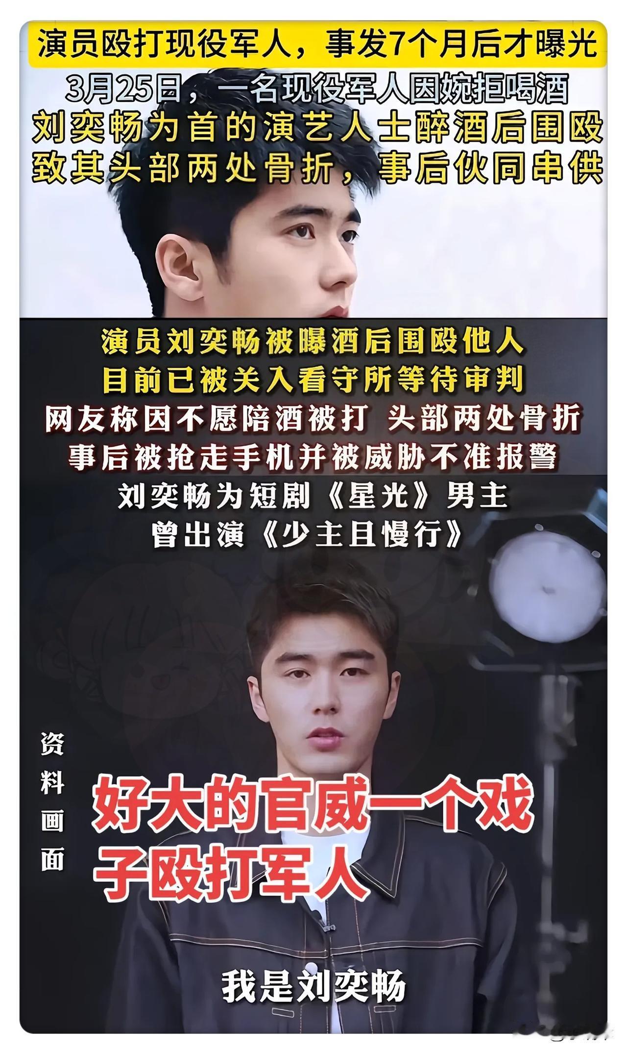 刘奕畅殴打军人 我特意去查下他,不查不知, 一查吓一跳,他的女友的行为不简单,怪不得,他能如此嚣张。 刘奕畅酒后因劝酒被拒,就带人围殴现役军人梁先生,用酒瓶砸头致骨折,事后不仅不道歉,还伙同女友李沐宸、同伙吴崇轩等人串供撒谎,甚至找关系压消息,嚣张到极点。 最恶心的不是打人,是他们把军人的克制当软弱,把公众人物身份当“免罪符”。李沐宸嘴上说“拉架”,聊天记录却暴露她忙着统一口径;吴崇轩一边转发拥军内容,一边商量甩锅,双面操作让人不齿。他们忘了,军人的退让是守护家国的素养,不是任人欺负的理由。 法律面前没有明星特权,更容不得亵渎军人尊严。那些帮着掩盖罪行的同伙,也该一起付出代价!你觉得对这类失德艺人该彻底封杀吗?
