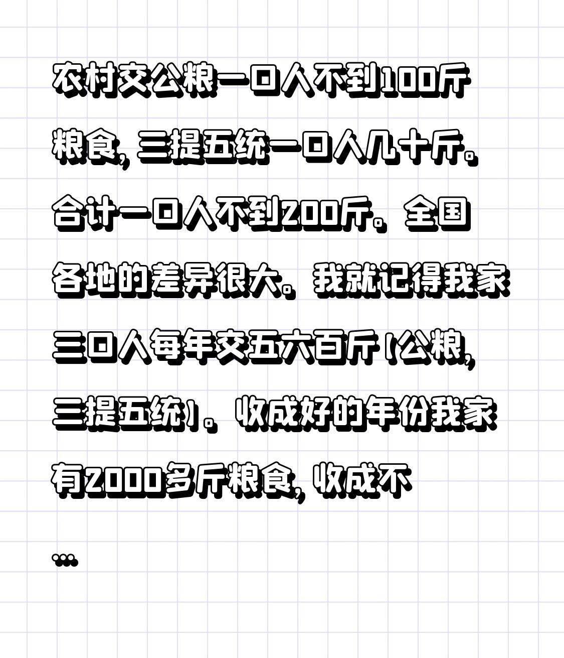 农村交公粮那会儿,一人交的粮食不到100斤,“三提五统”一人几十斤,算下来一人交的不到200斤。不过,全国各地的情况差别很大。我记得我家三口人,每年要交五六百斤【公粮,三提五统】。收成好的时候,我家能收获2000多斤粮食;收成不好,一年就只有1500斤【公粮三提五统占比三分之一,约500斤】。收成不好的年份就得借粮,不然全家都不够吃,只能吃原本用来喂猪牛羊的五谷杂粮。 交公粮交的都是最好的粮食,颗粒最饱满,也最干净,不然扣杂质、扣水分扣得厉害。自己留下来的粮食饱满度都差一些,还有发霉发芽的,不够吃也只能去亲戚朋友家借粮糊口。