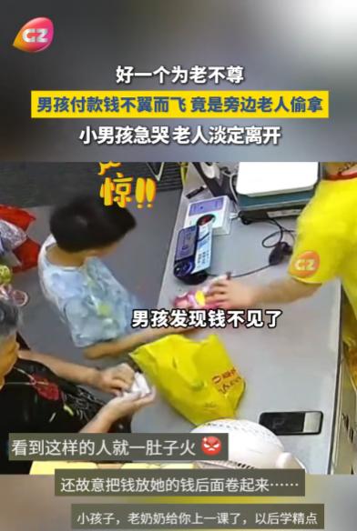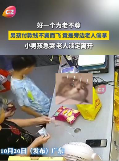 “太缺德了!”10月20日,广东,一小男孩买零食时将钱放在收银台桌面,一旁的老人