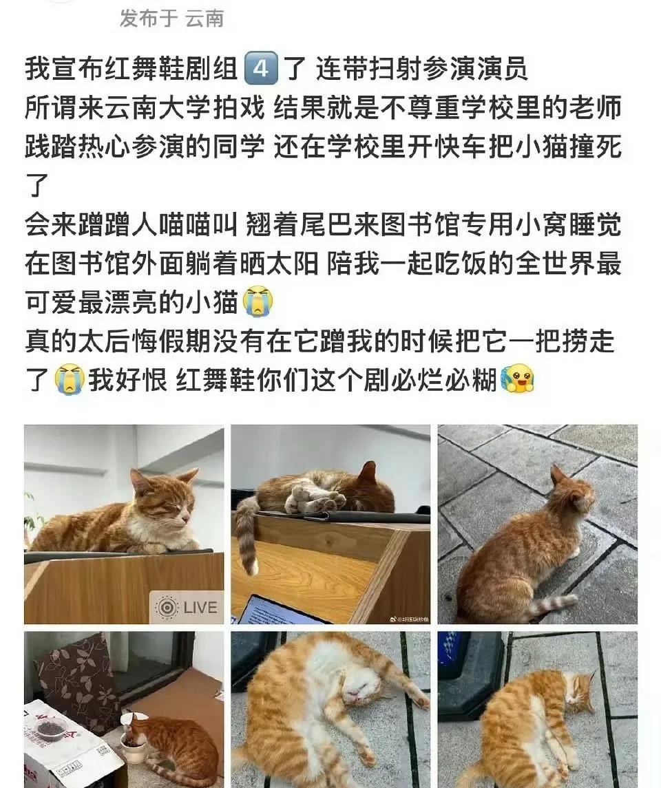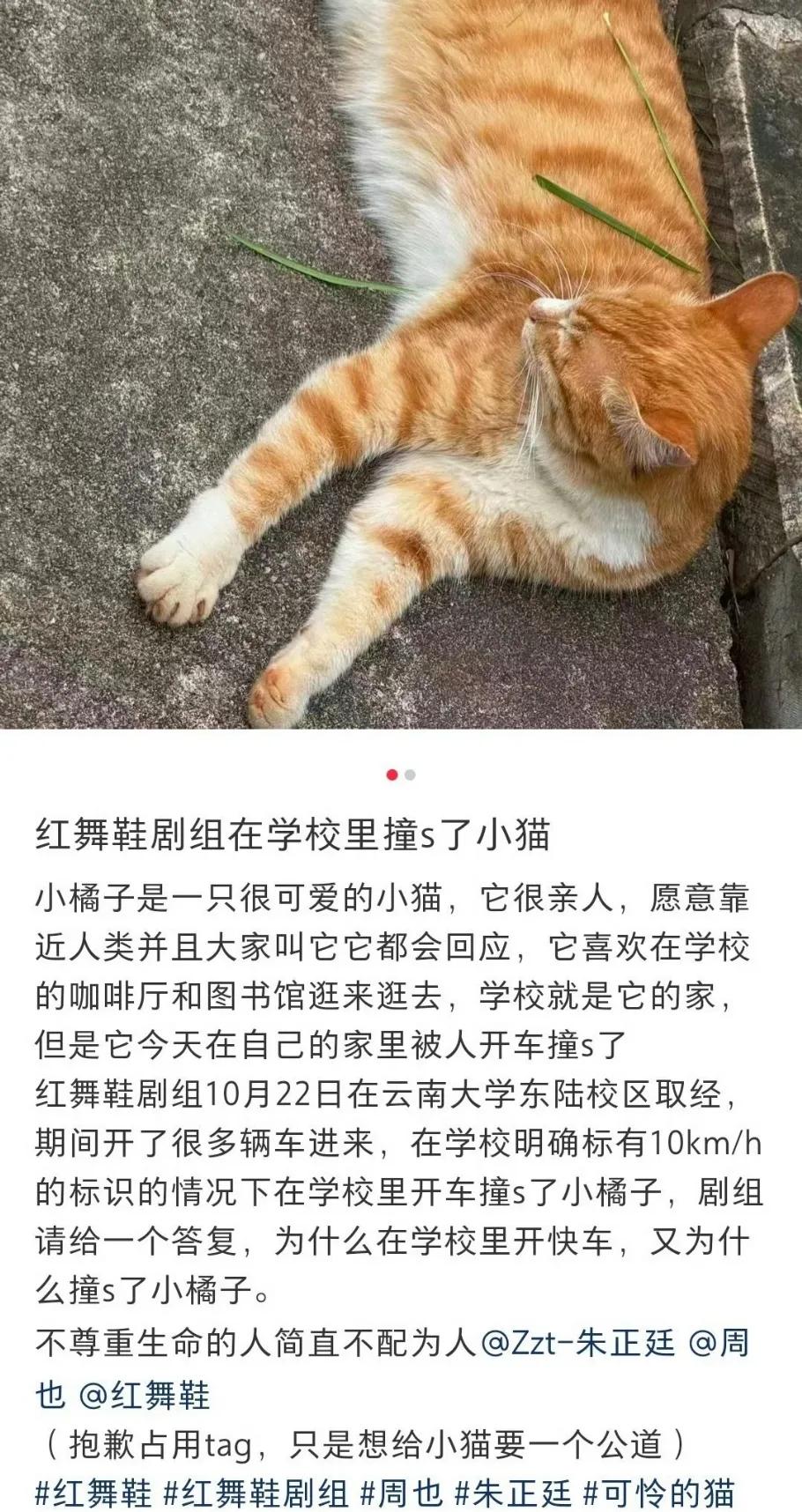 周也、王子奇《红舞鞋》剧组开快车撞死猫,遭学生抵制。 10月22日,电视剧《红舞鞋》剧组被曝在云南大学东陆校区取景期间,司机在限速10km/h区域超速行驶,撞死师生共同喂养的流浪猫“橘子”。 据目击学生描述,事发地点为银杏道十字路口,车辆碾压猫咪颈部后未停车处理,导致猫咪当场死亡。23日凌晨,剧组发布致歉声明,称司机因疏忽未发现有小动物在车辆附近,故而发生意外。目前司机已引咎辞职,剧组将以小橘子的名字成立基金用于校内流浪动物保护。 好干净的橘猫,一看就是被校园的人用心对待的! 云大的同学说“小橘子”不是野猫,它有自己的小窝,还有固定投喂的老师、同学和保安,它有固定活动的区域,就在图书馆和自习室附近。那天小猫只是出来晒个太阳,没想到在步行道上被车撞了。 看了一圈,这个剧组不是第一次这样,类似的事情很多,总之就是对人、对动物都很不友好的感觉。且不说是漠视小动物生命,在校园内,尤其是老校区行人众多的道路上超.速行驶,本身就是安全意识不高,不顾他人安危的行为。 就算没撞到猫在校园里开快车也很危险啊,学校道路窄各种小路大路交叉、下课上课人流量大,这次“没注意”是猫,那下次万一是学生呢?剧组有义务出面解决道歉。
