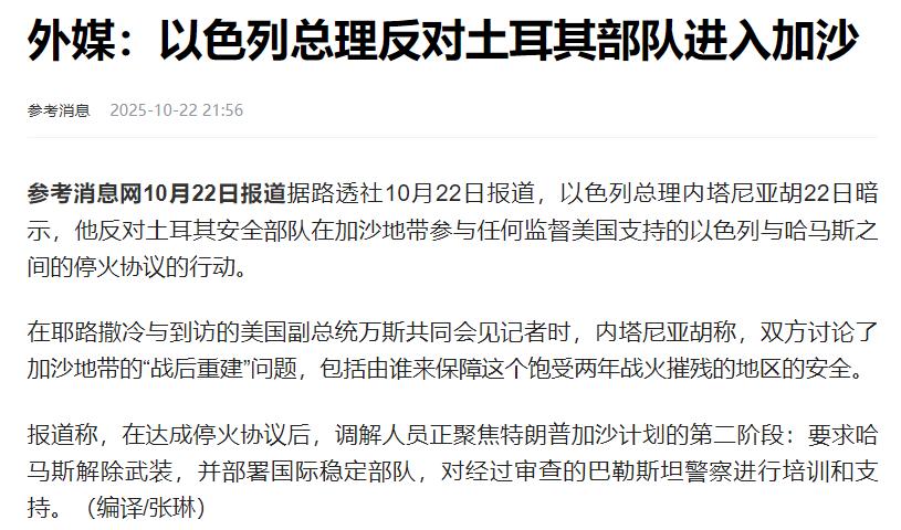 以色列发出警告,土耳其军队进入加沙地区就是红线! 10月22日,以色列总理内塔尼亚暗示,不同意土耳其军队进入加沙地区监督停火协议的执行。而这背后藏着的,是一连串现实利益的考量,每一条都戳中了以色列的关键诉求。 最直接的就是双方立场上的根本分歧,土耳其早在这次巴以冲突爆发前就一直明确支持巴以“两国方案”,简单说就是主张在1967年战争前的边界基础上,让巴勒斯坦和以色列各自建立独立的国家。 但以色列当前在加沙的军事行动,目标是彻底清除哈马斯武装,这和土耳其的主张显然不在一条线上。在内塔尼亚胡政府看来,只要不是明确站在以色列这边反对哈马斯,就容易被当成“偏袒”。 而且土耳其之前已经多次公开批评以色列对加沙的军事打击,这种态度让以色列打心底里不相信土耳其能公正监督停火,生怕土耳其介入后会打乱自己军事行动的节奏,影响最终目标的实现。 更让以色列头疼的是土耳其的北约成员国身份,这层关系让以色列根本不敢轻举妄动。 北约是美国牵头搞起来的军事同盟,有个“集体防御”的规矩,意思是如果一个成员国受到攻击,其他成员国可能要出手帮忙。要是土耳其军队真进驻加沙,万一以色列和这些部队发生直接冲突,就可能牵扯出北约的集体责任,到时候事情就复杂了。 要知道,以色列在很多方面都离不开美国的支持,比如先进的军事装备供应、国际舞台上的外交撑腰等,它肯定不想因为土耳其的事和美国主导的北约闹僵,所以土耳其可能的进驻对以色列来说就是个“烫手山芋”,实在难以接受。 而从实际影响来看,土耳其军队进加沙更是直接掐住了以色列的行动自由。 之前以色列在加沙的打法就是要全面推进,彻底消灭哈马斯的有生力量,即便现在签订了停火协议,但很显然以色列不会善罢甘休的。而一旦有外部监督部队在,以色列的军事部署和战术执行就会处处受限。 比如监督部队可能会对以色列的打击目标提出异议,或者要求停止某些可能造成平民伤亡的行动。内塔尼亚胡政府早就放话要“彻底掌控加沙战后的局势”,意思就是战后加沙的治理、安全安排等都得听以色列的,土耳其进来插一脚,显然和这个战略目标完全冲突。 但说到底,这个“红线”警告也暴露了以色列在巴以问题上不甘心就此打住的心态。 现在巴以局势本来就乱成一团,各方势力都在背后角力,以色列的这个警告不只是针对土耳其,更是在向整个地区传递信号,他还是没打算收手! 后续局势会怎么发展,还得看各方接下来的动作。