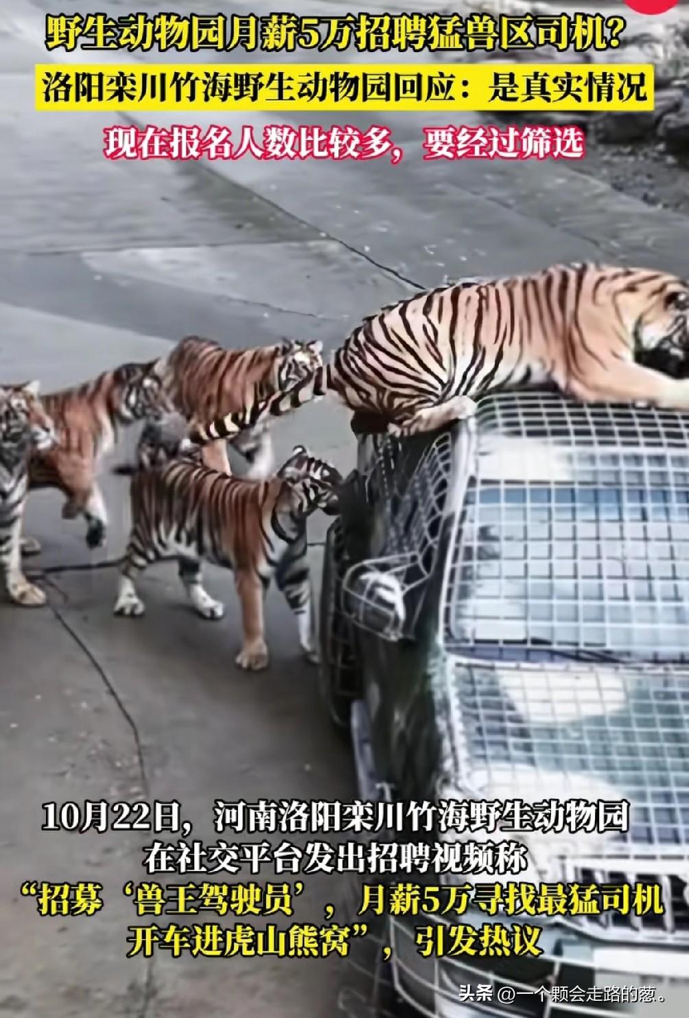 月薪5万招聘猛兽区司机, 招聘要求也很简单, 河南某动物园招聘兽王驾驶员,要求有C1驾照,5年的驾龄要胆大心细,胆子不大可不要。 需要开车进去东北虎、非洲狮、黑熊、狼等猛兽区域要投喂它们,投喂的活物和肉,应聘要有比较强的驾驶能力和处理事情的能力。 不是说你有驾照就行了,还要通过各种检测,要看你的心理够不够强大,这些动物看似都在园区内,可是这些动物都是散养的,危险性还是比较高的。 招聘广告一出来,就吸引了上百人报名,抖音后台私信很快就突破了上千人,因为只需要一位司机,现在已经暂停报名,本来报名截止时间到11月15日,没想到大家热情这么高,第一天就报名了300人。 不过想报名的别灰心,目前暂时还没有找到合适的人选,万一这些人都不合适呢,有需要的可以去搜下万一应聘上了呢。 这个工作不仅需要投喂动物,还需要开车带游客进入猛兽区,直面兽王的怒吼,这样的工作你心动了吗? 不仅不需要花钱买门票,每个月还有高额的工资,心动肯定是心动的,也得有这个本事挣才可以,这么多人报名,看来大家都自己都很有信心。 有网友调侃说,让大学生去我只要4万,给大学生1万。大学生是多不值钱。 也有网友说,怎么报名,我给老公报名。这是想报名呢,还是有别的目的呢!