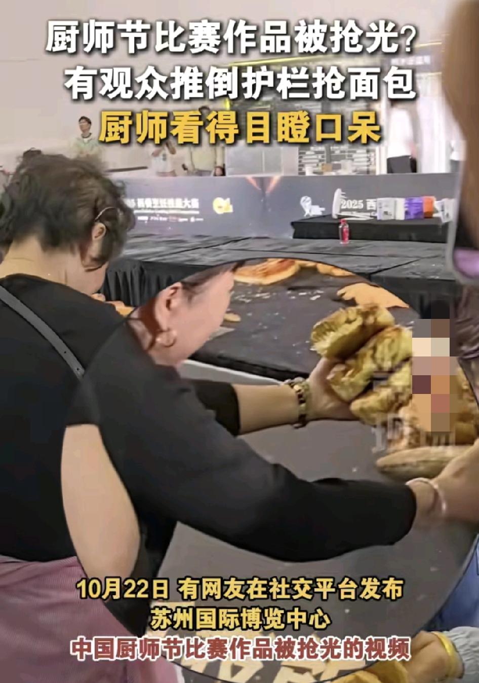 10月22日,网友分享了一段视频,有关于苏州国际博览中心中国厨师大赛现场,不少大妈在展台上抢走了许多做好的面包,厨师们看着目瞪口呆。不知道这些面包是否被主办方允许可以拿走,如果不是的话,这样的形象实在是太差了。