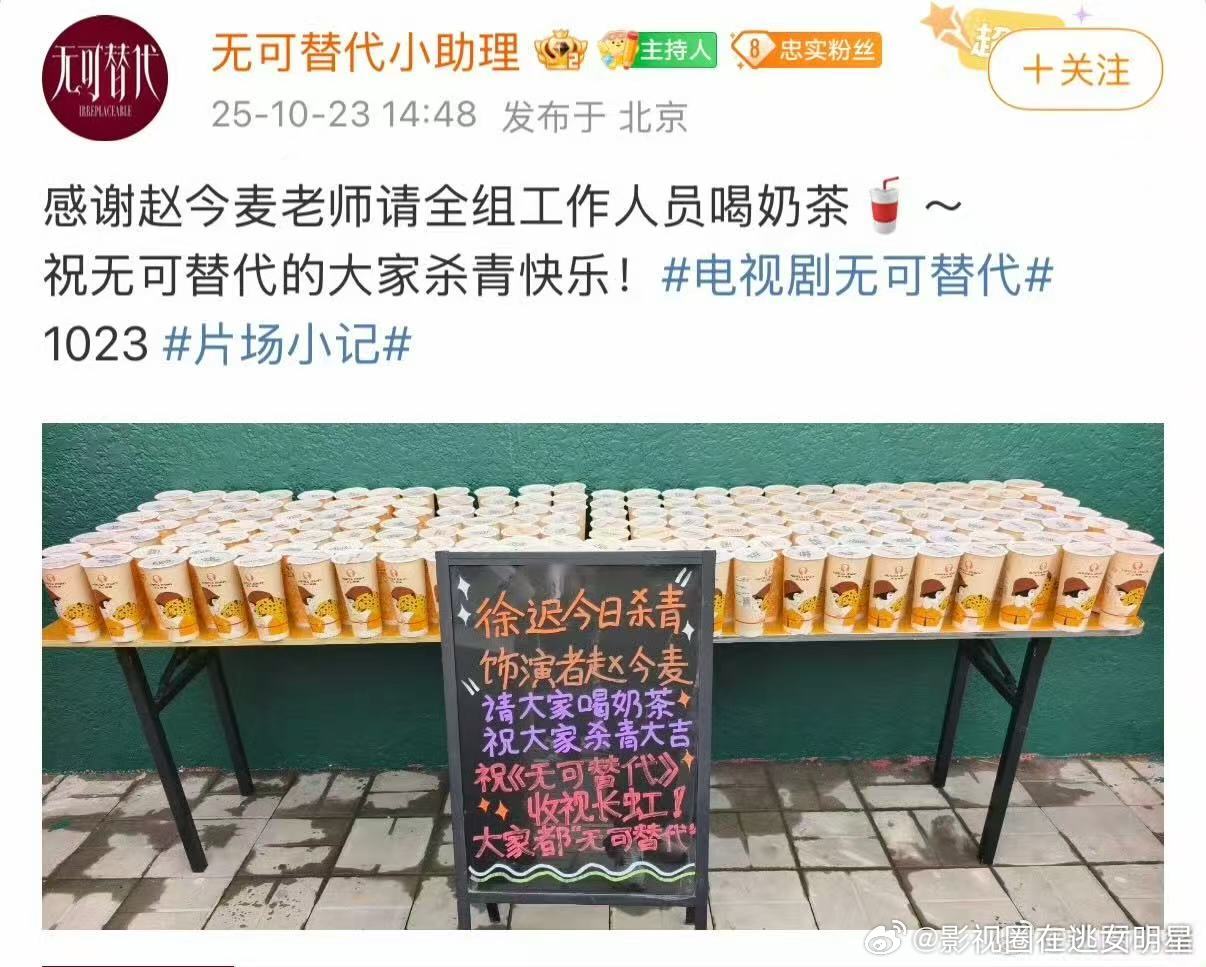 赵今麦无可替代杀青请剧组喝奶茶麦麦杀青啦~请剧组喝奶茶好暖心!希望《无可