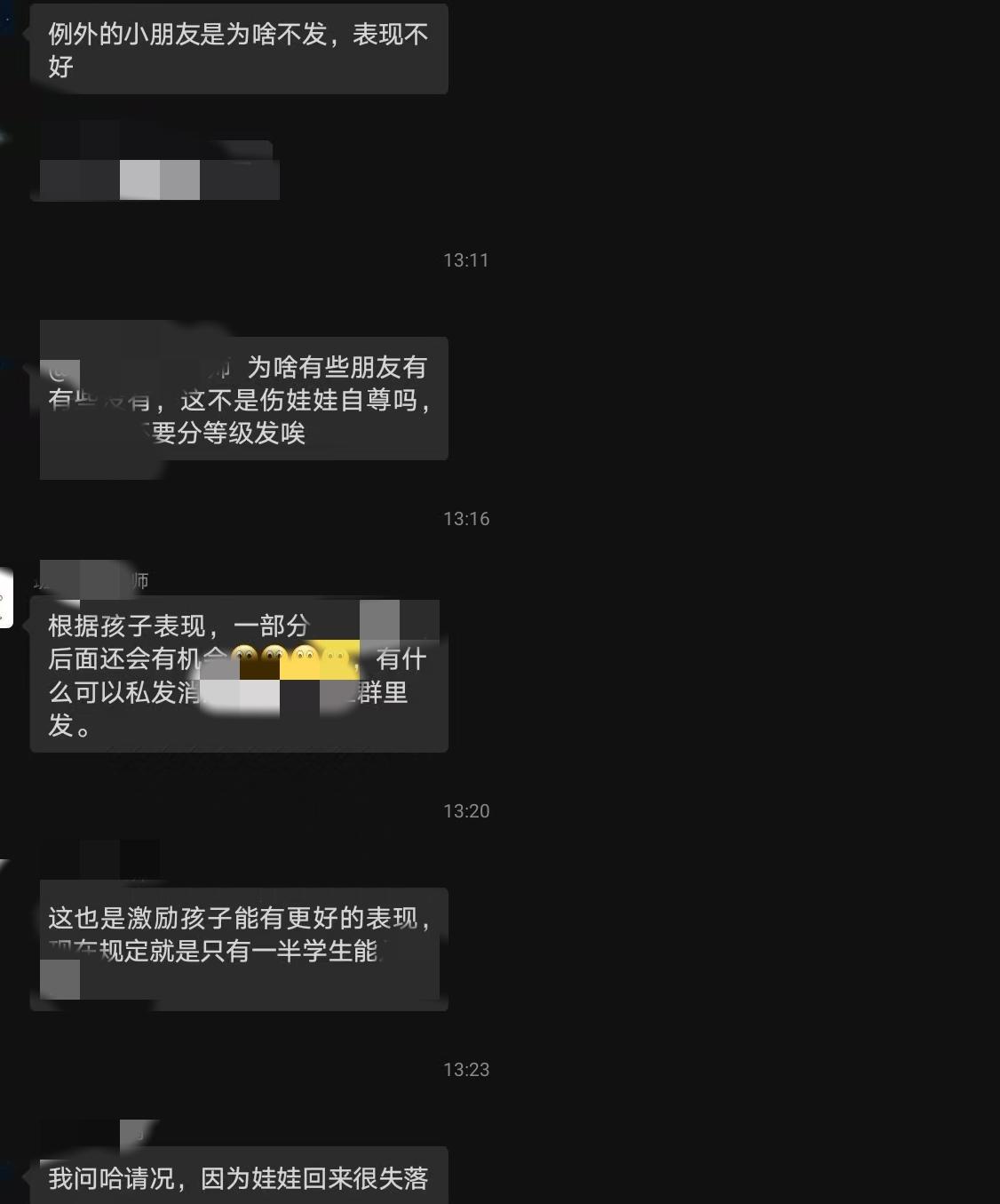 30个名额,61位同学参与——这意味着,注定有一部分孩子这次无法入选。 如果孩子未能选上,别因一时失落就在群里公开质问老师。私下与老师沟通多好,委婉地了解情况,比如询问孩子在校表现是否有需要改进之处,借此机会鼓励他继续努力。 这已不是幼儿园阶段,奖状并非人人有份。人生路上的挫折从来不会缺席,不如让孩子从小学习如何面对“未能如愿”,在经历中学会坚持与成长。