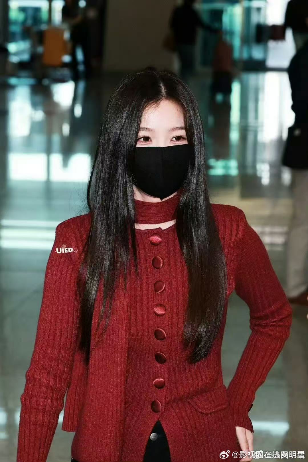 虞书欣首尔机场红衣出发路透红毛衣欣欣~好有秋冬氛围感!