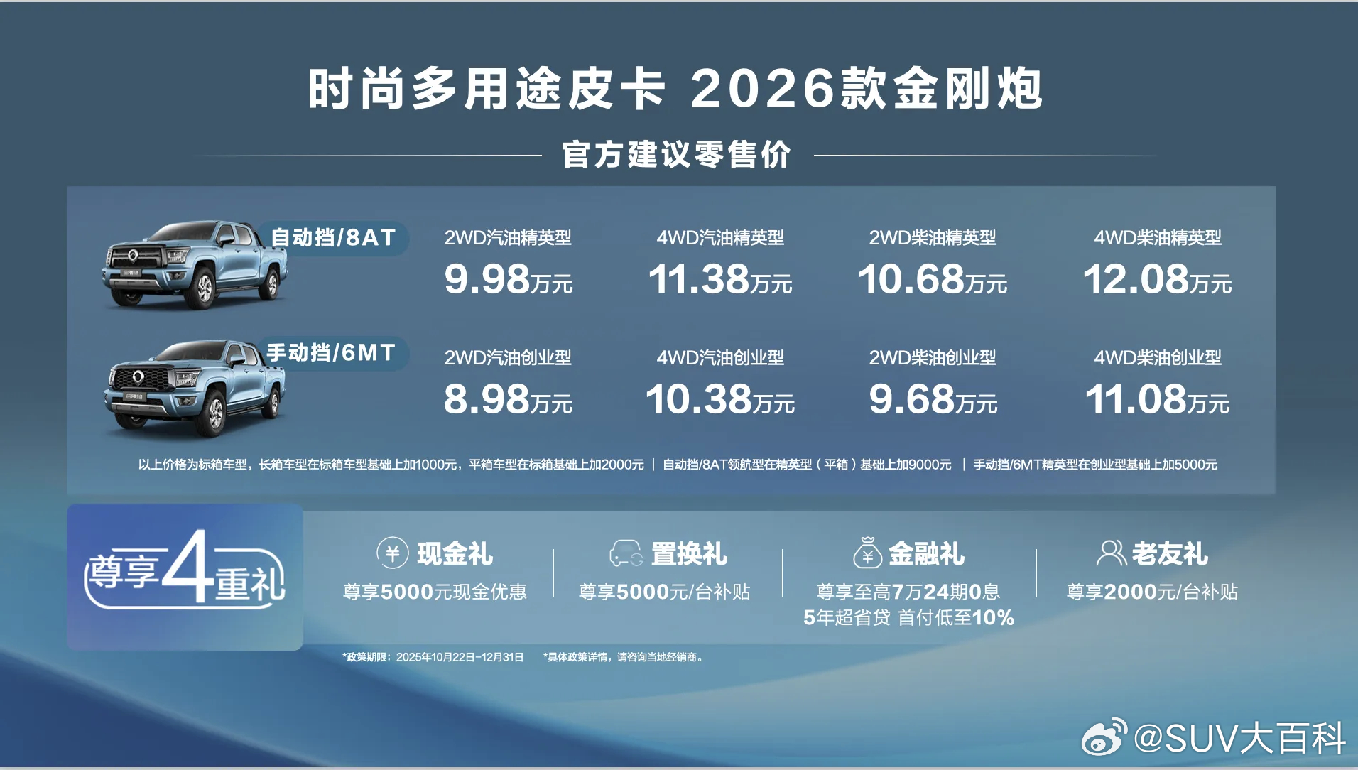2026款长城金刚炮上市 ,起售价8.98万元,8AT+10000,长箱+1000,平箱+2000