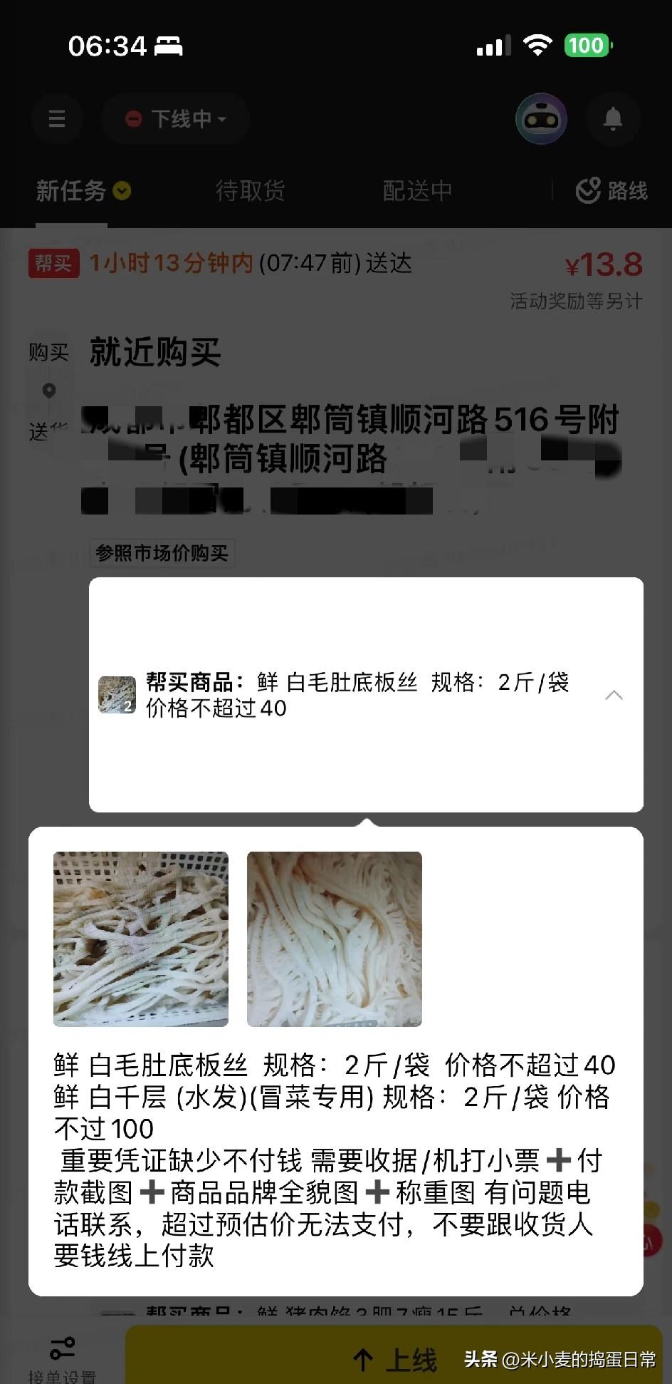 美团众包新手必看!看完再也不踩雷! 众包新手注意了!帮买单这玩意儿水太深!就像图里这毛肚、肉馅的帮买单,要求一堆凭证就算了,顾客要是不给收货码,分分钟取消订单让你白忙活! 但也不是全不能接,像熟悉的实体店老板常下的单就稳。咱挣点钱容易吗?这帮买单到底是机会还是坑?你们说该不该一刀切全拒了?