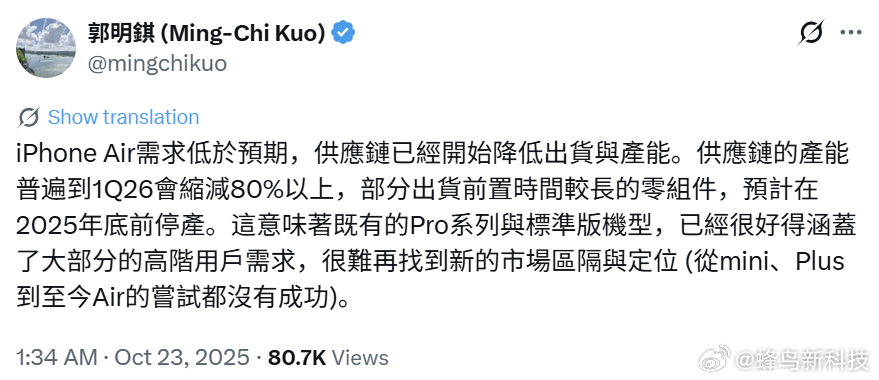 【iPhone Air需求不及预期,供应链将缩减超80%产能】天风国际分析师郭明錤今日指出,iPhone Air市场需求低于预期,供应链已启动产能调整,预计到2026年第一季度产能将缩减80%以上,部分前置期较长的零部件将在2025年底前停产。这表明现有Pro与标准版机型已充分满足高端用户需求,苹果在mini、Plus到Air等新市场区隔的探索均未达预期。
