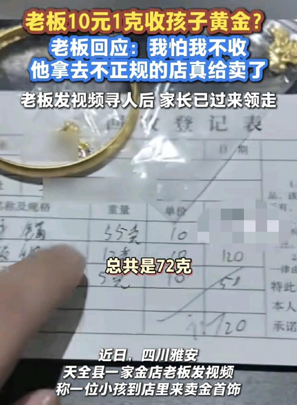 四川雅安一位金店的老板,收到了一名小孩子拿来72克的黄金老板,以10块钱一克的价格卖给小孩,老板已经发视频表示自己这样做的目的是如果不收下这不够黄金,孩子就会拿到别的店去卖,如果遇到了不怀好意的人,就会直接把经收下了,但是他希望家长看到他的视频干净,把黄金拿回去把720元退给他就可以。到目前是有什么办法可以更快的联系上小孩的家人?