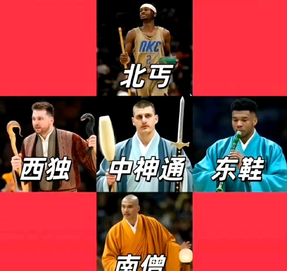 笑死,还有这么形象的华山论剑: 东鞋(字母哥) 西独(东契奇) 南僧(文班亚马) 北丐(莫兰特) 中神通(约基奇)