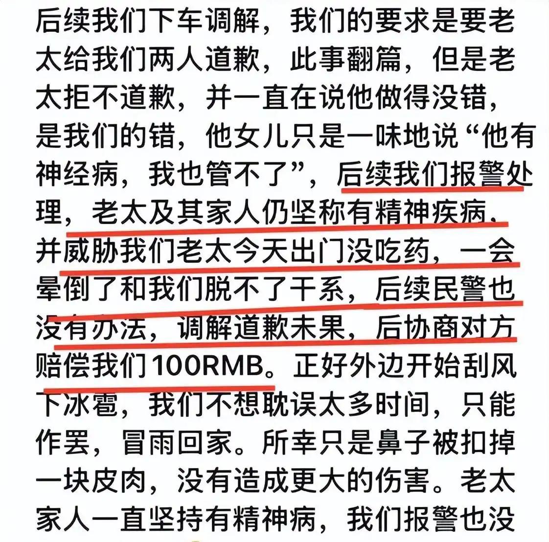 “没有天理了!”2025年9月,北京一女子乘坐地铁时,被大妈要求给抱有孩子的人让座,拒绝后遭大妈用手拍打,导致女子脸部被抠伤,下车后警方介入调解,女子要求老人道歉,不料,老人拒不认错,而老人女儿的一番话,让人意外,网友:这难道是新时代的“免死金牌”? “年轻人给抱孩子的让个座怎么了?没看见孩子要睡觉吗?”在北京这个拥有超过两千万人口的城市里,每天可能有千万次这样的行程发生。但不同的是,这一次,大妈的手掌竟然直接落在了女孩的脸上。 女孩想过会发生争吵,但没怎么都没想到对方竟然敢打人,跟她同行的朋友迅速掏出手机记录,可大妈见了直接扑上来抢手机:“拍什么拍!”双方推搡的过程,大妈直接把女孩的脸抠出了血。 事情的起因很简单,女孩和朋友先上的地铁,并找到了座位,大妈和抱着孩子的女儿是后上车的,可能是见到女孩两人跟年轻,就直接让女孩让座,但女孩累了一天,也想坐着休息,便礼貌地拒绝了。接下来发生的就是文章开头的那一幕。 虽然女孩脸上的伤痕很浅,几天就会愈合。但在警方的调解室里,大妈始终昂着头,没有道歉,没有后悔,只是在警方的调解下,给女孩赔了100块钱。 “我不在乎这一百块钱。我在乎的是,为什么做错事的人可以如此理直气壮?” 原来,大妈的女儿非但没有替母亲道歉的意思,反而以“大妈有精神病,她管不了”为由来给大妈的行为找借口。更让女孩愤怒的是,女儿还说:“我妈今天出门可没吃药,她要是被气晕了,你得负责!” 要知道,让座是情分,不让是本分。更何况,如果精神病成了免罪金牌,那明天大家是不是都要带着诊断书出门? 所以,女孩并没有息事宁人,而是选择了二次报警,警方也已立案调查。这个决定恰恰表明了,有人不愿意再接受“和稀泥”式的调解,不愿意再默认“闹事者有理”的潜规则。 而且,法律专家指出,即便存在精神疾病,监护人也有责任防止其危害他人。若监护不力,监护人本身应承担相应责任。 在地铁上的每个人,都有各自的疲惫、各自的理由、各自的委屈。女孩可能忙了一天,她的累是真的;大妈的女儿抱着孩子坐地铁,她的辛苦也是真的。 但我们不应该要求别人体谅你的苦,心疼你的累,然后接受你的道德绑架,并为你提供解决方案。 毕竟,没有任何一种“疾病”应该成为横行霸道的借口,也没有任何一块“金牌”能够覆盖基本的是非观。更不是一句“我有病”,就可以为所欲为。 对此,大家是怎么看的呢?欢迎在评论区留言讨论。 信源: 大象新闻——女子地铁拒让座,鼻子被大妈抠掉一块皮肉! 文│一阳 编辑│史叔