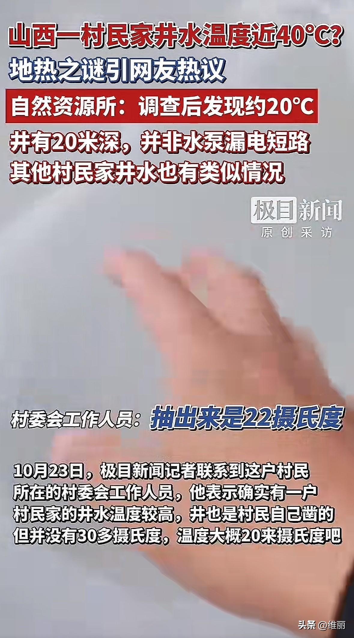 近日有博主发视频,说山西霍州成庄村一村民家井水有30到40℃,能直接洗漱,可其他村民家的井水是凉的。 村委会工作人员说,确实有这户村民,井是自家凿的老井,但水温没那么高,就20来摄氏度,井盖一直盖着,刚打上来的水会热点,后面就正常了。 自然资源所专家去现场查了,井深20米,水温大概20摄氏度,排除了水泵漏电短路的可能,推测是水泵长时间运行,或者井盖密闭保温导致的,其他村民家也有类似情况。 这事儿挺有意思,网上说的和实际检测差不少。井水异常升温先别猜地热、地震,先找专业人士排查原因更靠谱,毕竟像之前四川、陕西有类似情况,不少是水泵问题引发的。
