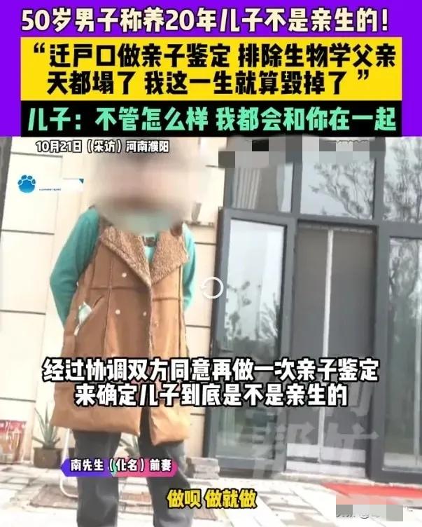河南濮阳,男子崔某与妻子2003年结婚,育有一儿一女。 崔某与妻子离婚时,妻子坚持带走女儿,崔某留有儿子。 崔某以为有儿子在身边,可以依靠,将来养老也有个盼头。 没想到,去年做亲子鉴定时,崔某发现养了20年的儿子,并非亲生。 崔某崩溃了,他找到媒体讨说法。妻子说,报告是假的,还不忘狡辩,说孩子一直跟她在一起,谁也没有碰过。 她拒绝透露孩子亲生父亲是谁。崔某满脸无奈,回忆起和儿子的点滴,说,自己不能坑儿子,一直以来对不起儿子,所以才把他养到这么大。 崔某说最可悲的是,妻子对谎言的坚持,让他背负“养了别人的孩子”的骂名,让孩子也在身份的错位中,承受了太多不该承受的事情。 现在,他不仅要面对亲子关系的破裂,还要承受一生的痛苦与悔恨。 麻烦看官老爷们右上角点击一下“关注”,既方便您进行讨论和分享,又能给您带来不一样的参与感,感谢您的支持!