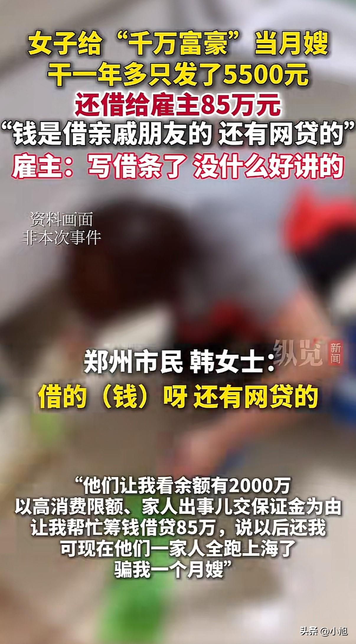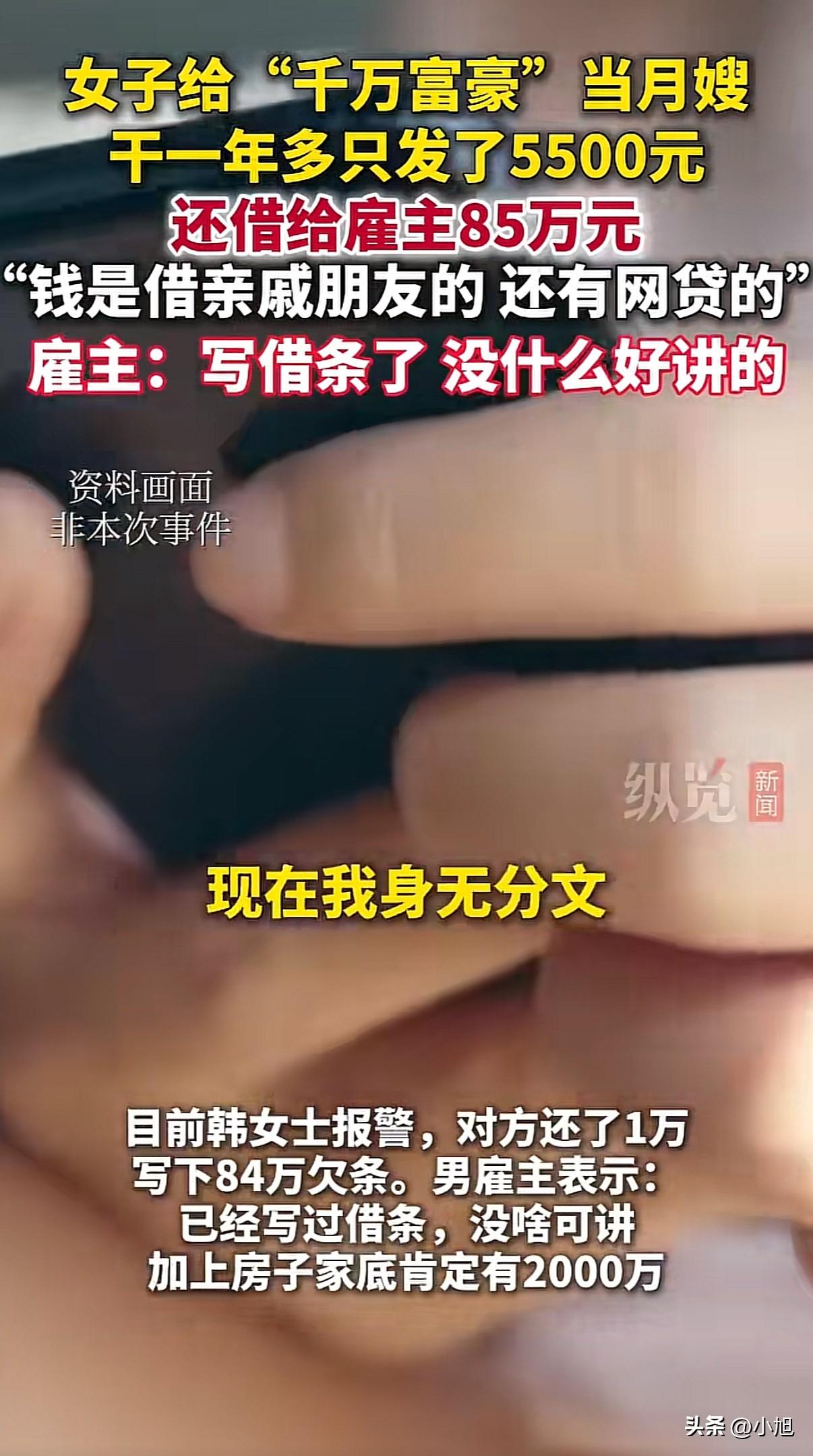 浙江湖州一月嫂,给“千万富豪”雇主干一年,工资就拿了5500,反倒被借走85万!