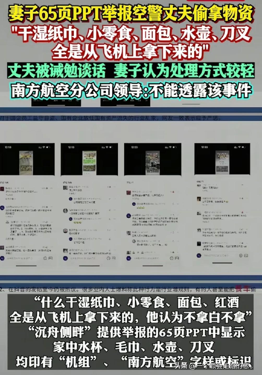 真是林子大了什么鸟都有,见过老公出轨妻子做PPT举报的,没见过老公偷拿公司小东西,妻子做65页 PPT举报的! 南方航空的王某某48岁,在南方航空担任空警,王某某有个小习惯,就是看到飞机上多余的,小零食、面包、红酒、饮料,不仅拿吃的,王某还多次拿飞机上的纸巾、湿巾、毛巾、水杯、水壶、刀叉等之类的小东西。 王某某觉得这些东西不拿白不拿,放在这里也是浪费,也会被别人拿走,就因为他这个习惯,最后被妻子举报。 有些没搞懂王某某的妻子的用意是什么,王某某拿的东西不算贵重,也是为了这个家,王某某的妻子是难道是怕自己老公犯大错吗? 南方航空收到王某某妻子的举报,对王某某进行诫勉谈话,都这样了王某某妻子还不满意,认为南方航空处理结果太轻了。 王某某的妻子就找到媒体曝光此事,有这样的老婆真的王某某八辈子修来的“福气”,别人都把老公混的不好,她是怕老公过的太好。 对于王某某的事情,南方航空表示这是他们内部的事情,没有什么重要信息要透漏,最后的决定要交给总部。 估计南方航空也不是想把事情搞大,比较拿的也是一些小东西,也不能构成犯罪,事情闹大了肯定会影响公司的影响! 有网友认为,这女的绝对出轨了,被发现了要钱离婚,王某某不同意,这女的才想起了自己老公这么多年往家拿东西回来,以为这位可以毁掉自己的老公,没想到公司只是批评了下,没有让开除他。