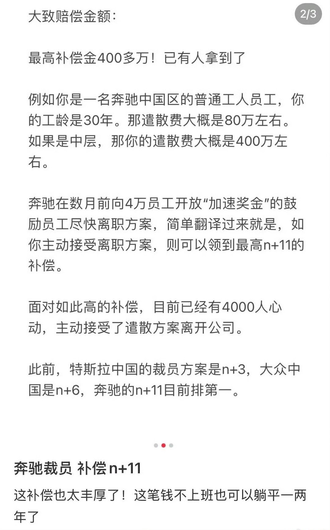 网传奔驰离职方案N+11补偿 网传奔驰推出离职方案大礼包,据报道目前已有4000人接受该方案。然后有人算了一下,如果你工龄30年,职位普通员工,大概可以拿到80万。如果是管理层,最多可以拿到400万。如果是你,你接受这个大礼包吗[泪] ​​​