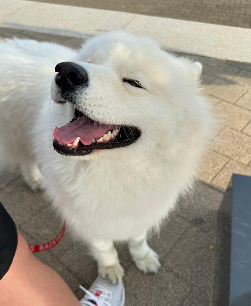 蝴蝶停在了萨摩耶的鼻子上,耶耶笑了