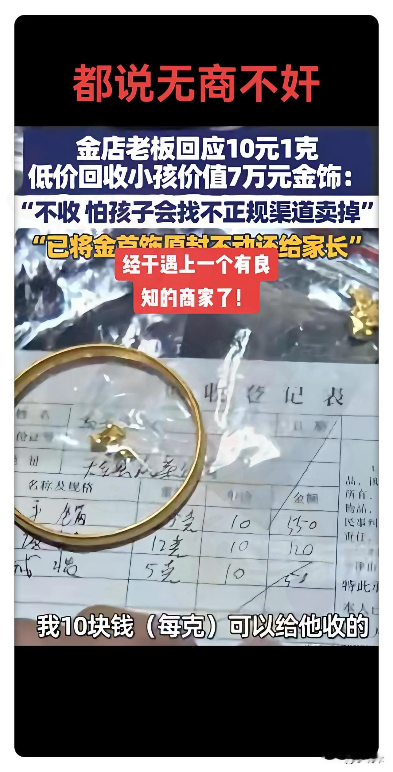 这个金店老板出名了! 别再夸老板善良了!四川雅安这位金店老板的操作,根本不是单纯的好心,而是藏着最聪明的生意哲学。72克黄金市价近7万,他却只花720元“回收”,转头就找家长归还,这波操作看似亏了,实则比赚大钱更有价值。 很多人觉得老板傻,放着到手的利润不赚,可他心里门儿清:直接拒绝孩子,金饰可能被黑作坊低价收走,一个家庭就得多一笔损失;顺着孩子的意收下,既稳住了财物,又给家长留了挽回的机会。这哪里是做生意,分明是用小成本做了件暖到人心底的事。 现在太多商家只盯着眼前的利益,却忘了最珍贵的口碑是靠良心攒出来的。老板这波操作,不仅守住了一个家庭的财产,更守住了做生意的底线。你觉得如果换成其他老板,会做出同样的选择吗?