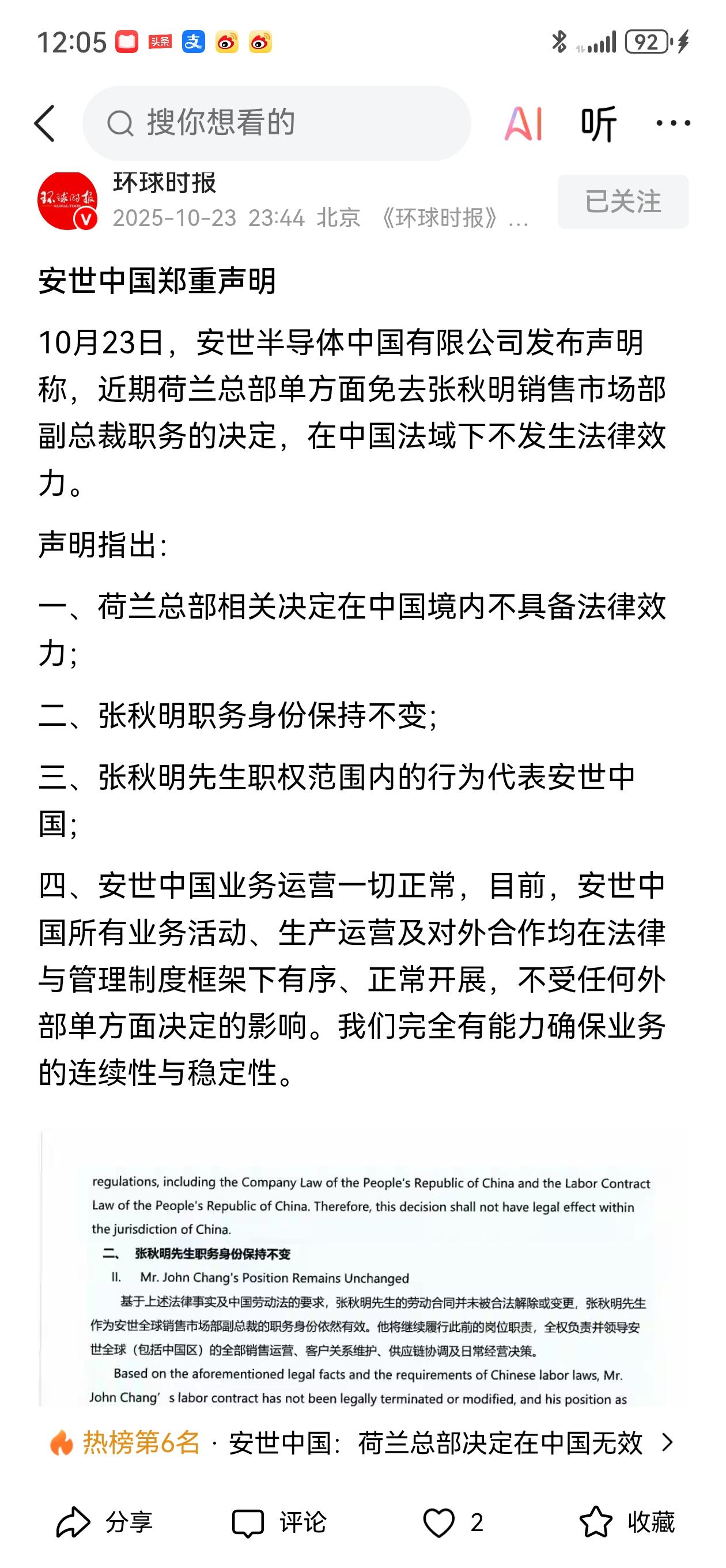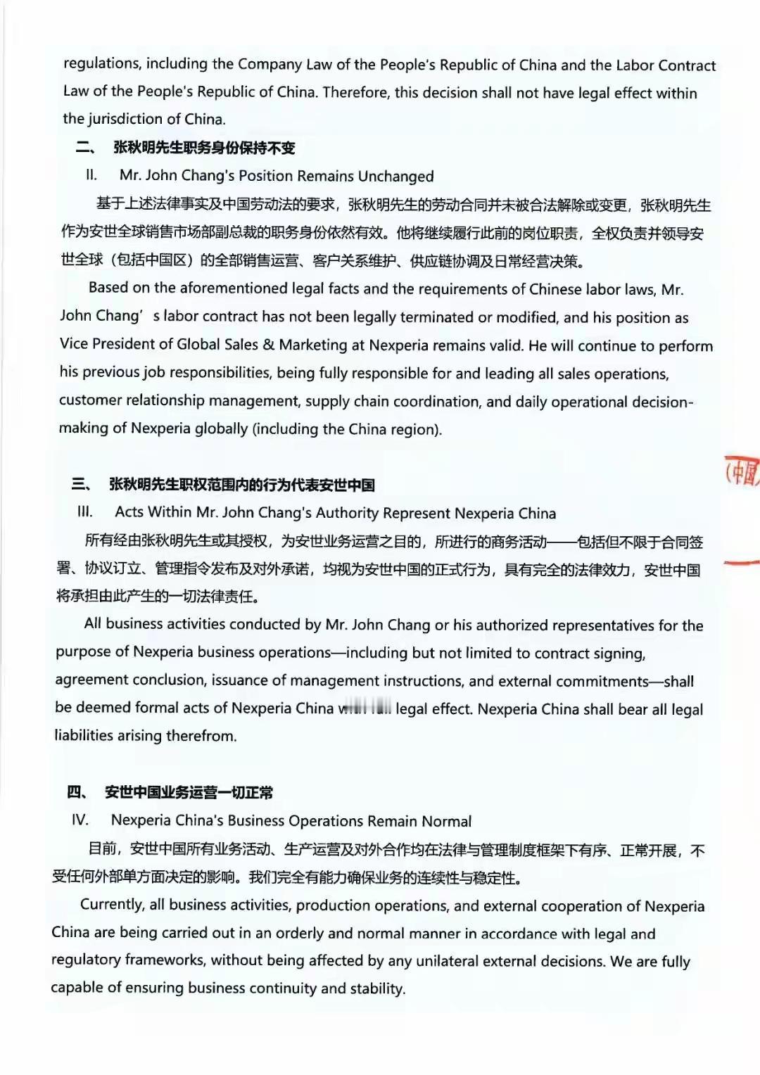 新加坡联合早报今天(10月23日)报道:“荷兰晶片制造商安世半导体的争议持续延烧之际,知情人士透露,在中国子公司被禁止出口部分零部件、公司一度暂停所有出货后,子公司已恢复向中国经销商供应半导体。” 双方博弈仍在继续,荷方暂无纠正错误的迹象。荷兰安世拒付中国七千名员工薪金,安世中国则宣布自行发薪并拒绝将营销收入汇入荷兰。荷兰安世总部近期单方面免去张秋明市场销售部副总裁职务,今天安世中国发表声明指出(图2~4),荷兰安世总部相关决定在中国境内不具备法律效力。 对于荷兰“强抢”安世半导体,已经引发连锁反应。美国、欧洲甚至日本大型汽车制造企业哀嚎声一片,由于相关半导体零部件供应中断,德国大众汽车旗下经典车型高尔夫面临停产,数千名德国工人被迫缩短工时,甚至有喜提毕业大礼包的可能。荷方泛化国家安全概念,强行接管并插手企业内部事务,违反契约精神和市场原则,害人害己。