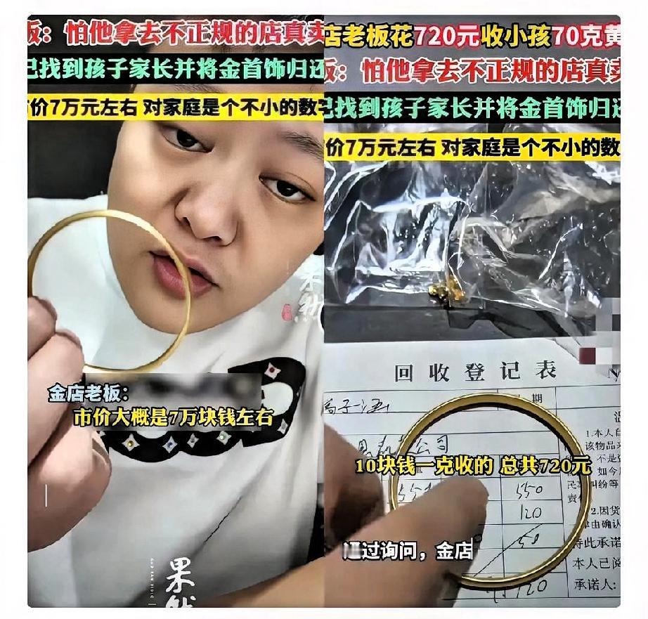 这个金店老板出名了! 四川雅安一小孩到金店卖首饰,金店老板以720元一克回收70克黄金,老板说,小孩来卖的黄金不可能是自己买的,一般小孩不会花钱买首饰戴,还说,小孩来卖黄金可能是家里有困难,急用钱花,也有可能是家里人做坏事的,让小孩来卖黄金赚钱。 他不放心小孩单独去卖黄金,就问小孩家里电话号码,准备给家长打电话,让家长来金店看看黄金是怎么回事。 金店老板说,这70克黄金值7万多元,对于普通家庭来说,这7万元可是一笔不小的数目,不管黄金是怎么来的,他都不想让小孩吃亏在外面,见着不好的坏人把小孩的黄金抢走。 麻烦看官老爷们右上角点击一下“关注”,既方便您进行讨论和分享,又能给您带来不一样的参与感,感谢您的支持!