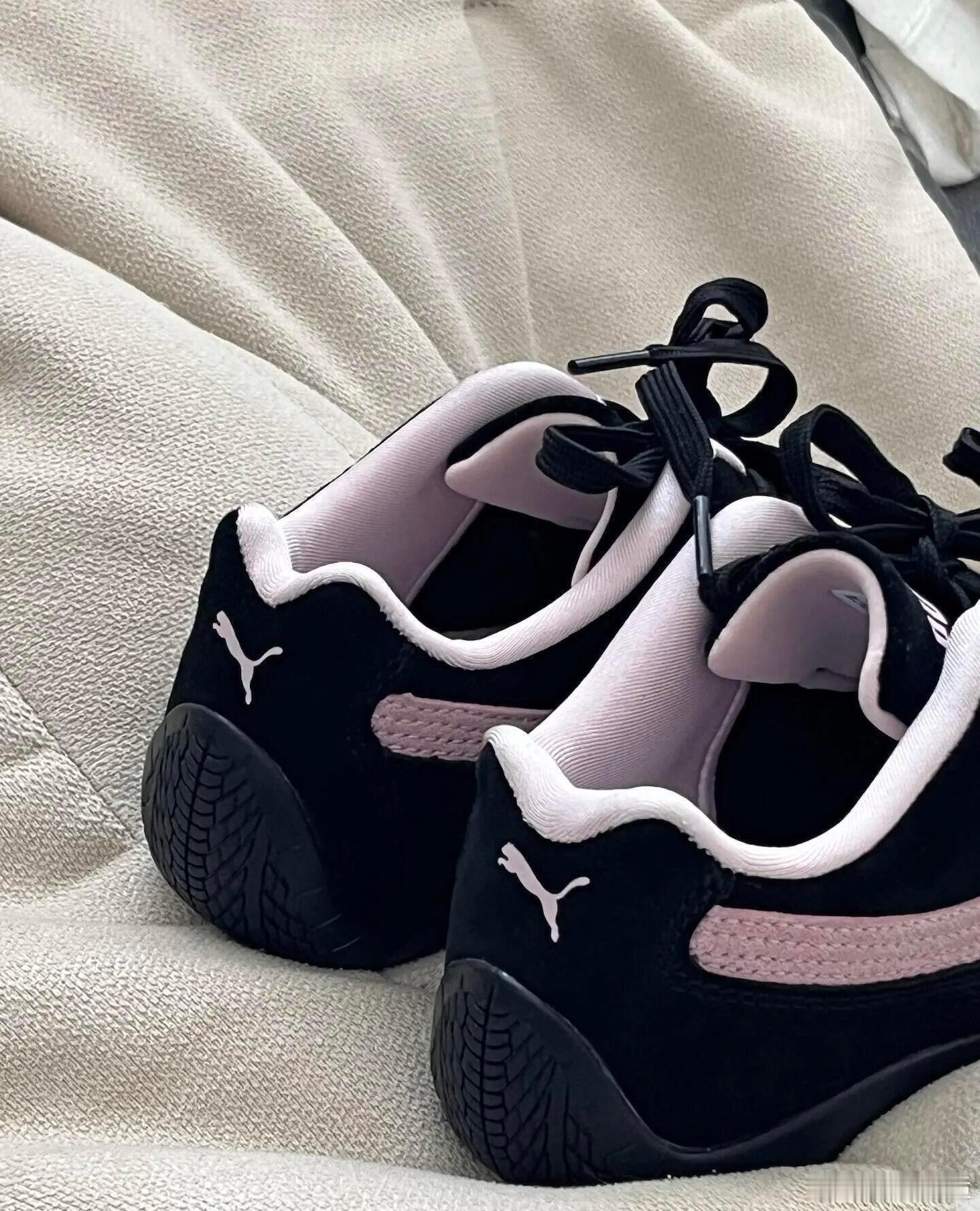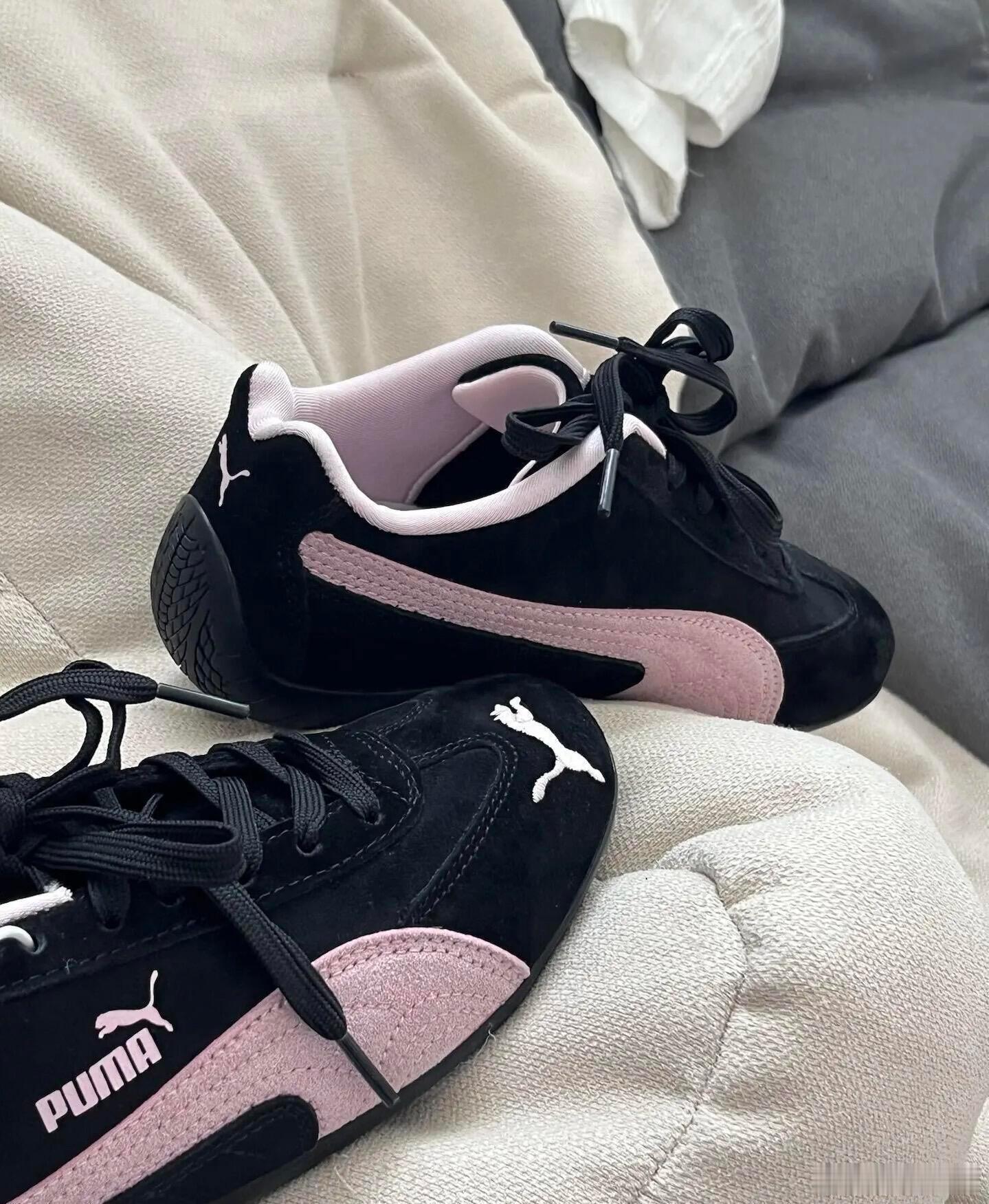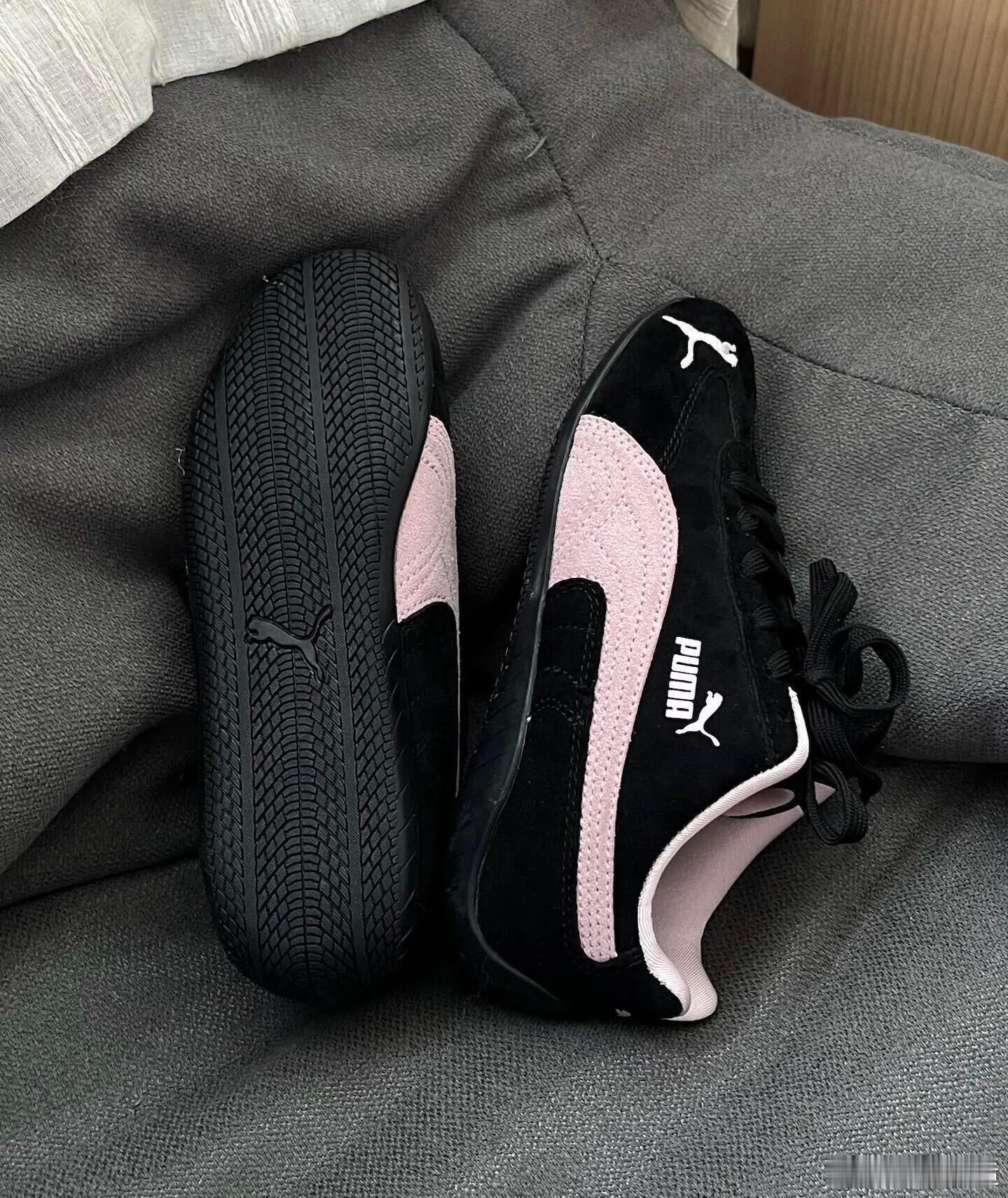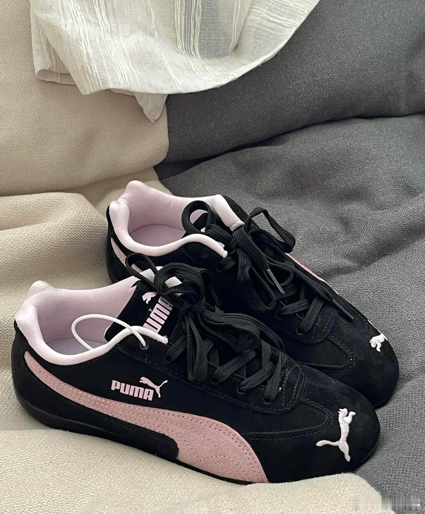 这双PUMA运动鞋以经典的黑粉配色彰显时尚活力。鞋身主体采用黑色设计,侧面饰以醒目的粉色跑道条纹,与鞋舌、鞋口处的粉色内衬巧妙呼应,形成强烈的视觉冲击。白色的品牌标志与美洲狮图案点缀于鞋面,细节精致。鞋子采用常规系带系统,配备黑色鞋带,确保包裹性与舒适度。其简约流畅的鞋型轮廓兼具运动感与日常休闲风格,无论是放置于家居沙发还是纯色背景上,都展现出PUMA品牌融合运动性能与潮流美学的设计理念。时尚鞋履