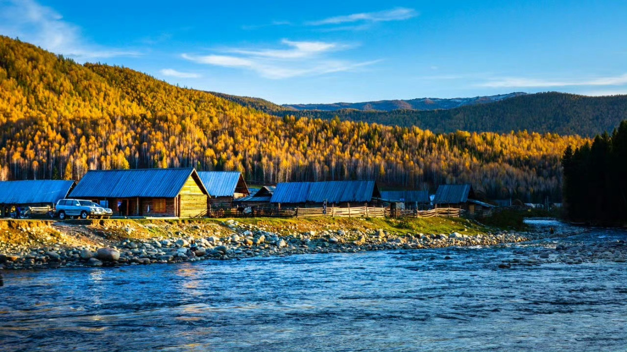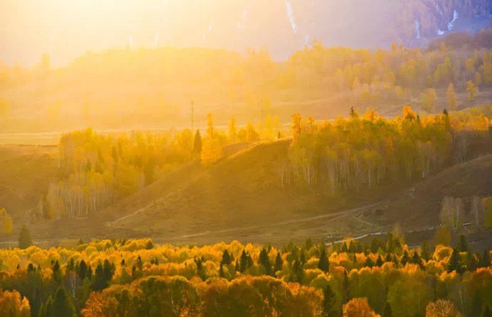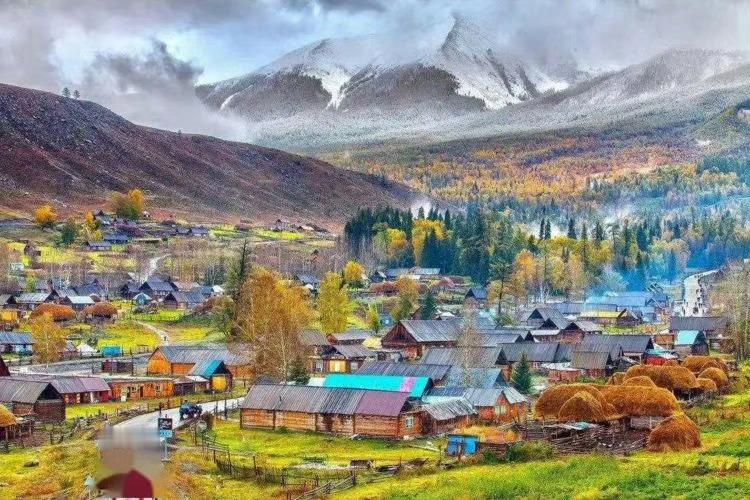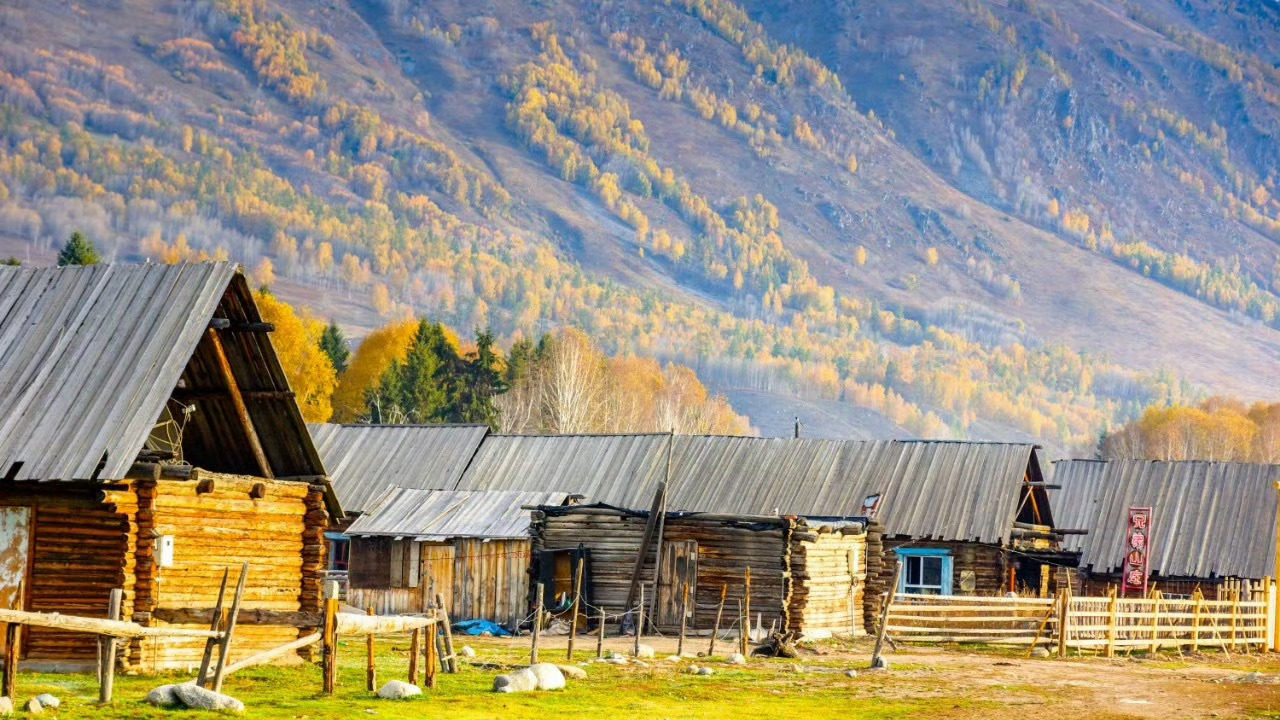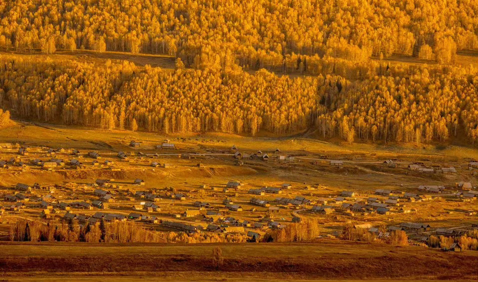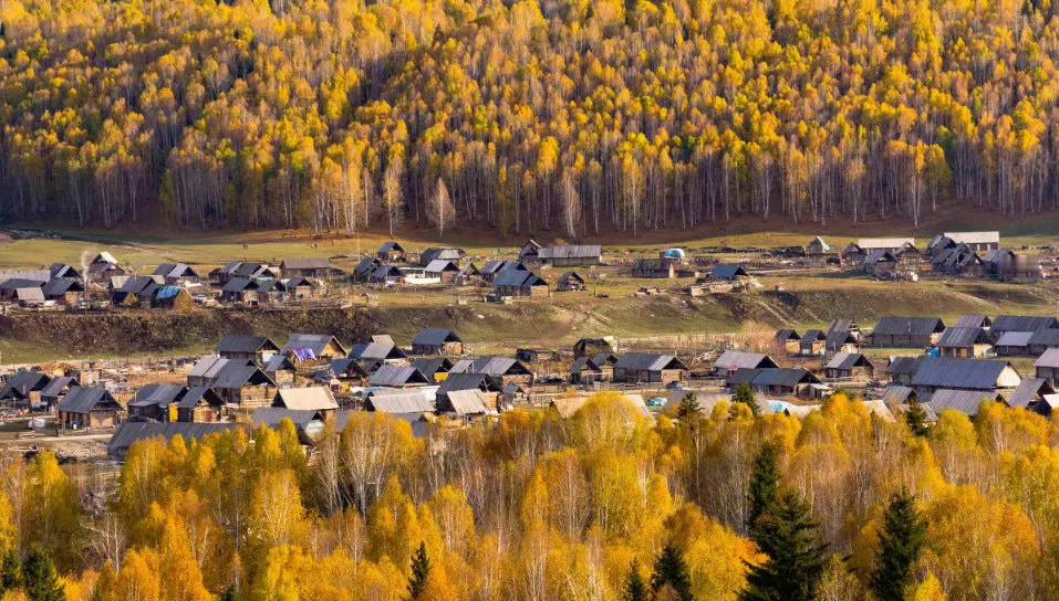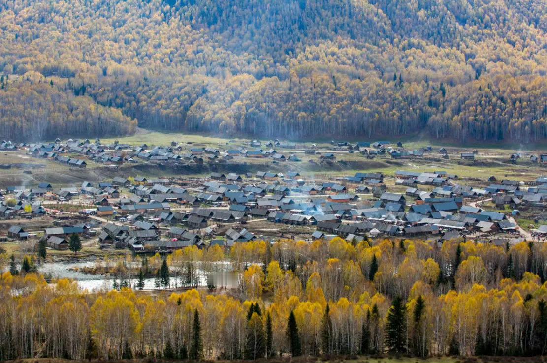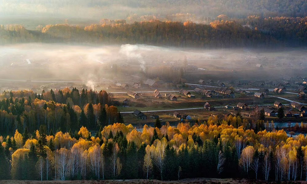 新疆 禾木村,袅袅炊烟在秋色中冉冉升起,形成一条梦幻般的烟雾带,宛如仙境。