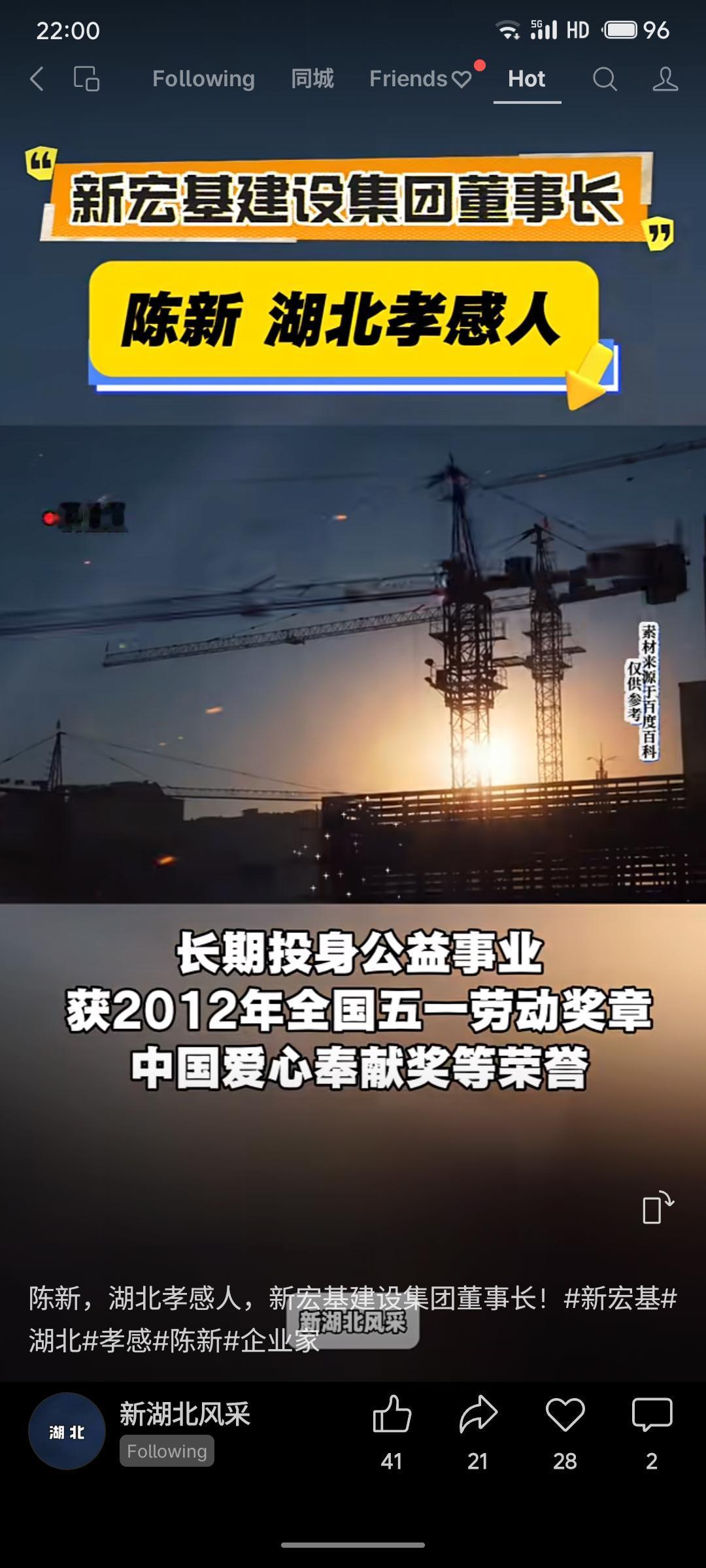 带定位聊本地新鲜事新宏基建设集团董事长陈新,湖北孝感人。其企业为国家高级总承包企业,入选中国建筑及房地产开发百强。他长期投身公益,曾获全国五一劳动奖章等荣誉。