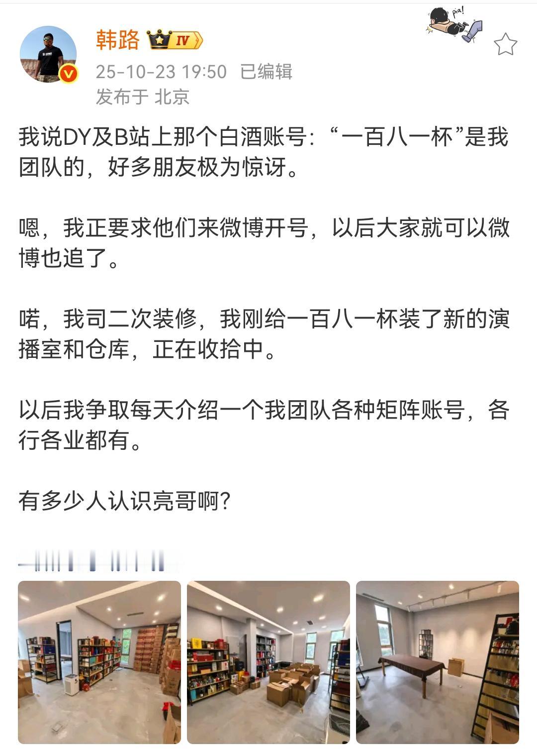 韩路:我们公司的矩阵账号特别强大!那个白酒账号:“一百八一杯”是我团队的,好多朋友极为惊讶! 韩路说光衣服白牌就有50多个,具体有哪些品牌他自己都记不住,因为汽车业务相对来说还是太窄了,所以公司发展出来了矩阵账号在方方面面都在做。 韩路的公司叫做锋巢,如果看到有MCN是这家公司的,都是韩路旗下的。 各位是怎么看的?欢迎评论区留言。