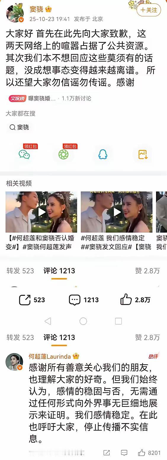 谁能想到!全网猜了大半个月的“向太道歉”没等来,倒是等来了窦骁主动下场道歉,何超莲还紧跟着发文感谢,这波夫妻同心直接把吃瓜节奏带飞了! 要知道俩人今天都在北京同框,感情稳定得藏都藏不住,之前传的“感情生变”压根是捕风捉影。其实仔细想想也对,小两口之前忙着搞事业,哪有时间理会闲言碎语?何超莲说得特实在,大家关心他们是好意,但感情是两个人的私事,真没必要天天拿出来“证明”。 而且说句实在的,窦骁对何超莲的在意肉眼可见,能随时随地照顾女方情绪的男人,真没那么好找。至于三太“考验”的说法,更像是长辈对女儿幸福的谨慎,完全能理解。现在还有消息说俩人在积极备孕,之前超莲还盼着“足球队”早点来,说不定过阵子就有好消息了! 其实感情里哪有那么多狗血戏码?像他们这样低调搞事业、用心经营感情的才最难得。你们觉得,这对啥时候会官宣好消息?来评论区聊聊你的看法!