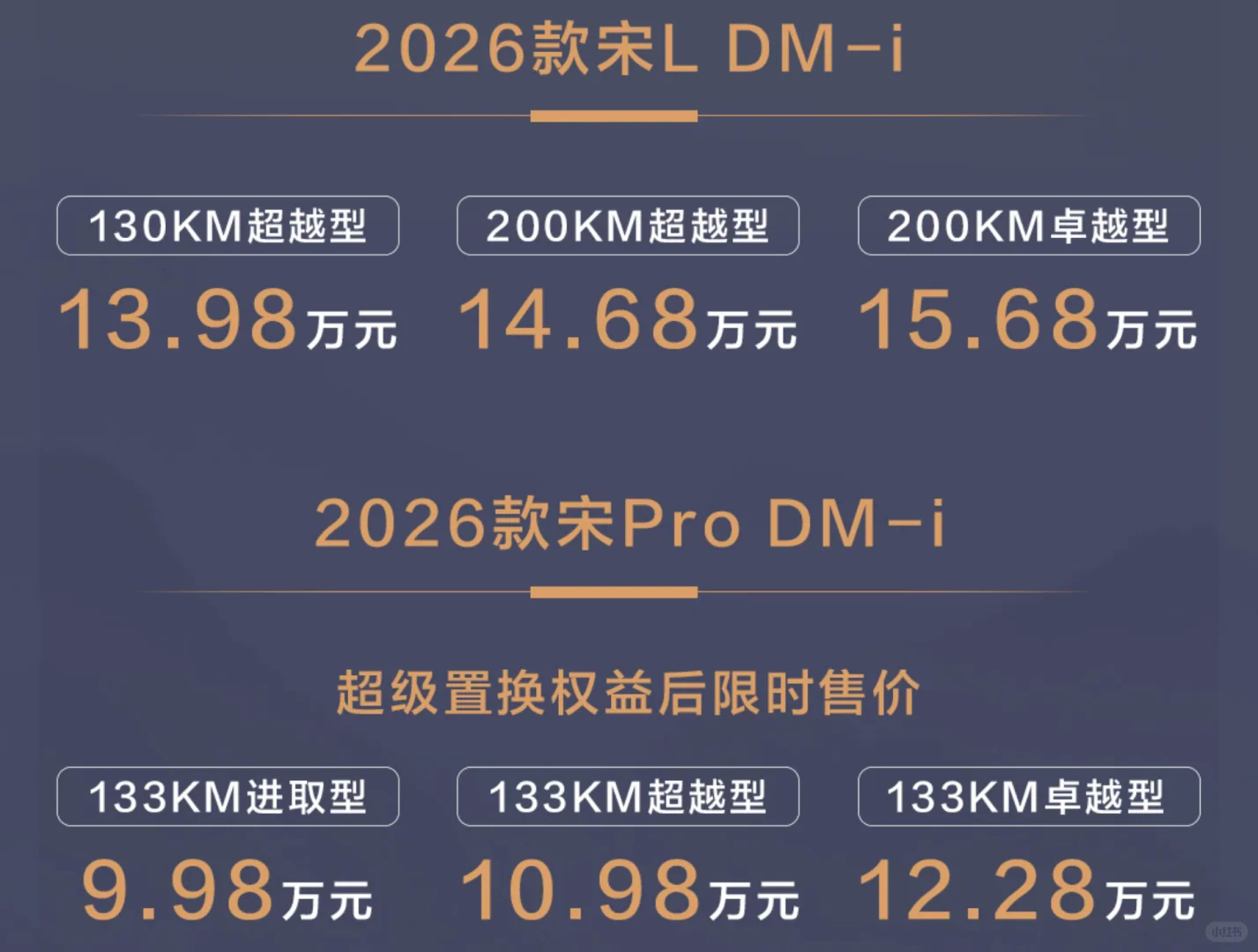 先看核心的续航和定价:宋 Pro 纯电续航 133km,起售价 9.98 万;宋 L 续航 130km,13.98 万起;秦 L 也有 128km 续航,9.68 万就能入手。这续航水平,日常通勤一周充一次电完全够,就算短途跨城,纯电模式也能 cover 大部分路程,比很多同级混动车型的 50-80km 续航实用太多。