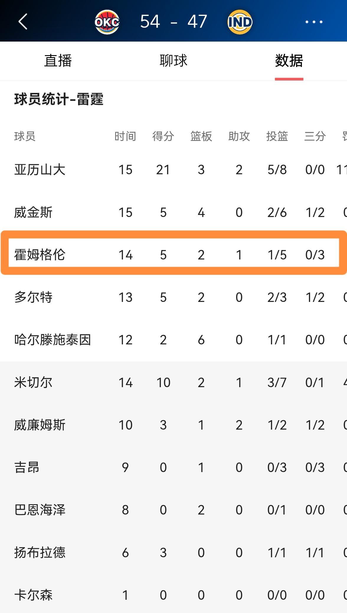 雷霆三当家霍姆格伦真是太拖后腿了!今天雷霆客场挑战步行者,目前双方的上半场比赛已经结束,雷霆以54:47领先对手7分。在前两节比赛中,霍姆格伦的表现非常失常,他在首发出战的14分钟里,投篮5中1,其中三分球3中0、罚球4中3非常低效的得到5分,他的场上正负值为全队并列最低的-2。 总体来看,霍姆格伦在上半场比赛中的表现是让人非常失望的,他在攻防两端都没有打出应有的表现。
