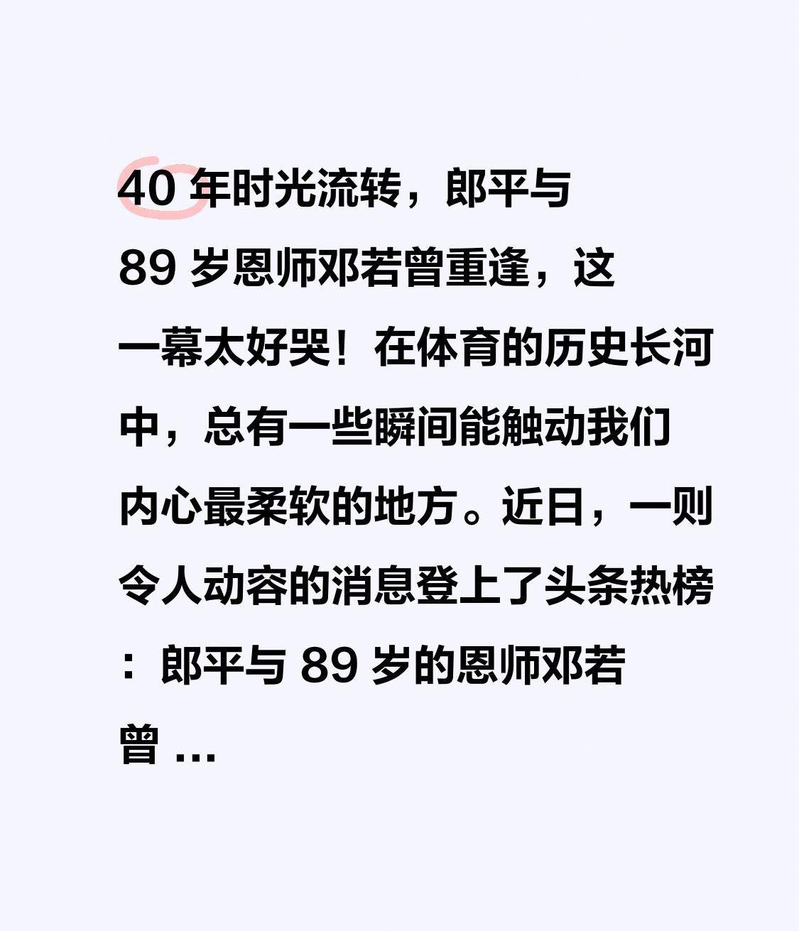 40 年时光流转,郎平与 89 岁恩师邓若曾重逢,这一幕太好哭! 在体育的历史长河中,总有一些瞬间能触动我们内心最柔软的地方。近日,一则令人动容的消息登上了:郎平与 89 岁的恩师邓若曾 40 年后再重逢。这跨越了 40 年的师生情谊,在重逢的那一刻,仿佛时光都为之停留。 郎平,这个名字对于中国体育迷来说,无疑是如雷贯耳。她是中国女排的传奇人物,是“铁榔头”,带领中国女排取得了无数辉煌战绩,激励着一代又一代的中国人。而邓若曾,这位曾担任中国女排主教练的老人,是郎平排球生涯的重要引路人。 40 年前,邓若曾慧眼识珠,将年轻的郎平招入国家队。在他的悉心指导下,郎平开始在排球赛场上崭露头角。邓若曾不仅传授给郎平精湛的排球技术,更培养了她坚韧不拔的精神和团队协作的意识。那时候,中国女排正处于崛起的关键时期,师徒二人携手并肩,为了共同的目标努力拼搏。 时光匆匆,40 年过去了。再次重逢,郎平已从当年那个青涩的排球小将成长为世界知名的教练,而邓若曾则已是一位年近九旬的老人。当两人相见的那一刻,没有过多的言语,只是紧紧地相拥。这一抱,包含了 40 年的思念、感激与敬意。 据相关体育专家分析,这种跨越数十年的师生情谊在体育界并不多见。它不仅仅是个人之间的情感纽带,更是中国体育精神传承的一个缩影。从邓若曾到郎平,再到如今中国女排的年轻一代,这种师徒相承、薪火相传的精神,正是中国体育不断前进的动力源泉。 在这个快节奏的时代,人们往往容易忽略那些深厚而持久的情感。而郎平与邓若曾的重逢,让我们看到了师生之间那份跨越时间和空间的真挚情感。它提醒着我们,无论走得多远,都不能忘记曾经给予我们帮助和支持的人。 这一场 40 年后的重逢,也让我们对中国体育的未来充满了希望。相信在这种精神的传承下,中国体育将会涌现出更多像郎平一样的优秀运动员和教练,继续书写属于中国体育的辉煌篇章。 亲爱的读者们,看到郎平与恩师的重逢,你是否也被这份深情所打动呢?欢迎在评论区分享你的感受,让我们一起为这份跨越时空的师生情点赞! 总结:郎平与 89 岁恩师邓若曾 40 年后的重逢登上,这一感人场景唤起了人们对往昔岁月的回忆。40 年前,邓若曾发掘并培养了郎平,师徒二人共同为中国女排的崛起奋斗。如今重逢,紧紧相拥的画面令人动容。体育专家指出这体现了中国体育精神的传承,也提醒我们不能忘记曾经的引路人。这场重逢让我们对中国体育的未来充满期待,也希望大家能在评论区分享自己的感受。郎平 女排主帅之我见