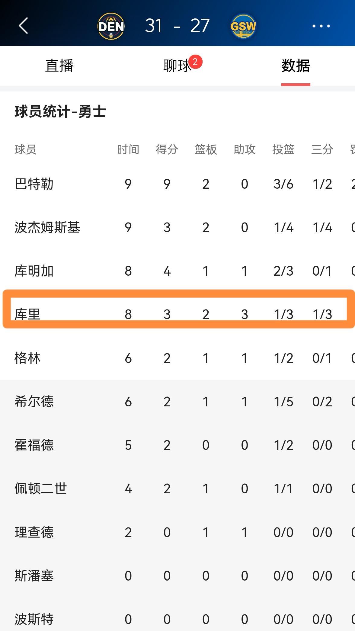 勇士超级巨星库里真是太拉胯!在今天勇士主场迎战掘金的强强对话中,目前双方的第一节比赛已经结束,勇士以27:31落后于对手。在首节比赛中,库里的表现非常的一般,他在首发出战的8分钟里,投篮3中1仅仅得到可怜的3分,他的场上正负值为-3。 如果勇士想要在主场击败掘金,库里必须在接下来的比赛中打出应有的水平,不然的话勇士很难赢球。