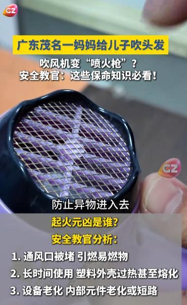 “防不胜防!”10月22日,广东茂名,一女子正用电吹风给儿子吹头发,谁知电吹风竟然突然变成“喷火枪”,溅出的火花把孩子的衣服都烫出了几个洞,女子赶忙拔掉电源,网友:这也太吓人了! 几乎家家都有吹风机,不论男女洗完澡都会用吹风机吹吹头发,可在使用吹风机前,最好是先检查一下通风口。 一女子刚帮儿子洗完头,她拿出家中的电吹风,插上电源,开始给孩子吹干头发,谁知,女子开启电吹风没一会,通风口突然开始喷火,吹风机秒变成“喷火枪”,溅出来的火星子把孩子身上的短袖都烫出好几个洞。 这可把女子吓了一跳,但她怕烫到孩子,走远了才将电吹风扔掉,电源也被女子拔了下来,随后她将一旁惊魂未定的孩子拉到身边安慰。 女子感觉到一阵阵后怕,孩子头发比较短,如果当时吹头发的是自己,估计头发已经着火了,还好没出现什么大意外。 那么,女子家的吹风机为什么会突然着火呢?其实这个可能性有很多,通风口被堵、内外部元件老换损坏等等。 不少网友觉得这也太吓人了,其实正确使用吹风机一般不会发生这种问题,以后使用吹风机时,可一定要小心谨慎! 信息来源:《一妈妈给儿子吹头发,吹风机变“喷火枪”?安全教官:这些保命知识必看!#吹风机安全 #家用电器隐患 》广州广播电视台