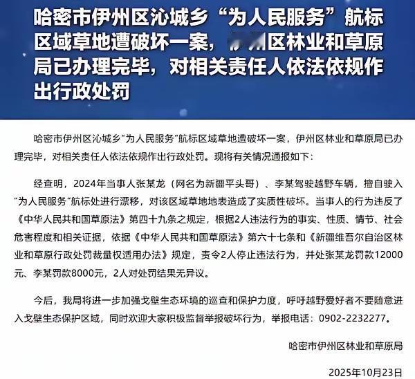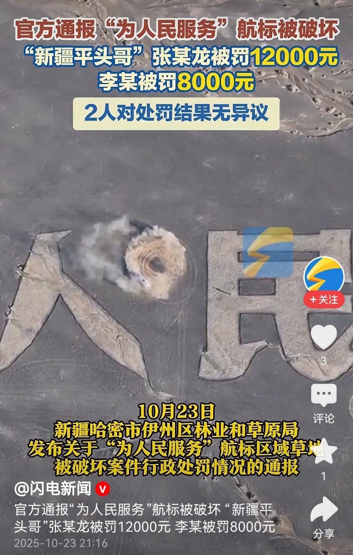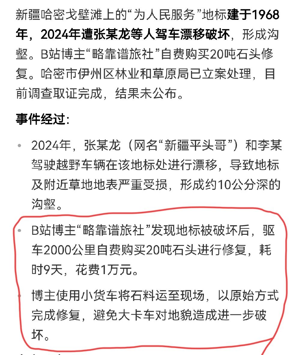 难道没有人认为对破坏“为人民服务”标语这俩货只处罚2万元,实在太轻了了吗? 这根本不只是对草地地表造成了破坏。 如果就只是这一点伤害,恐怕不会引起全国老百姓这么大的愤怒。 最近几年有一点感觉很奇怪: 小事大责,大事小责。 希望这只是作者一个人的错觉。 最后非常感谢博主“略靠谱旅社”。 是他发现地标被破坏后,自费购买20吨石块,驱车2000多公里,耗时9天进行修复。 为有“略靠谱旅社”这样的同胞感到温暖,为他点赞。
